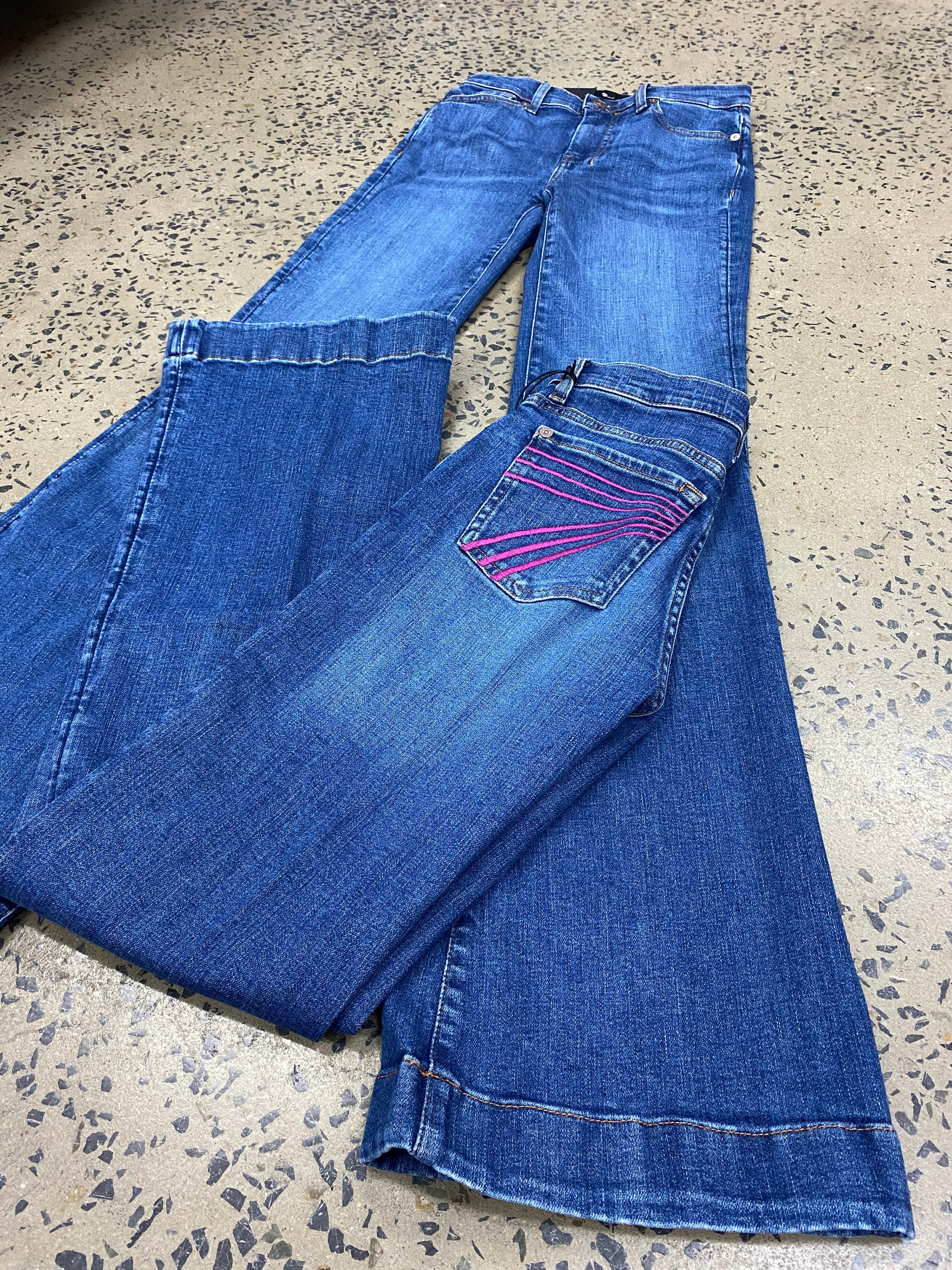 LEG LENGTH - Leg length of jeans is always the second number in jeans size for example a 25/34 is a waist size 25 with a 34 inch leg length. If trouser cut/flare jeans are longer than the actual length of your leg, unlike bootcut, you don't get 'scrunch' you get 'drag'. Because they are wide at the bottom they won't sit up on your boot, they will sit over it so anything longer than the actual length of your inside leg is going to drag. We recommend if you want a flare/trouser jeans for riding to go longer and cuff the bottom hem up when walking around. To work out the length you need for dress jeans just measure your inside leg from croutch to the floor in inches. If your leg measures 32 get a 32, if it measures 33 get a 34 etc.