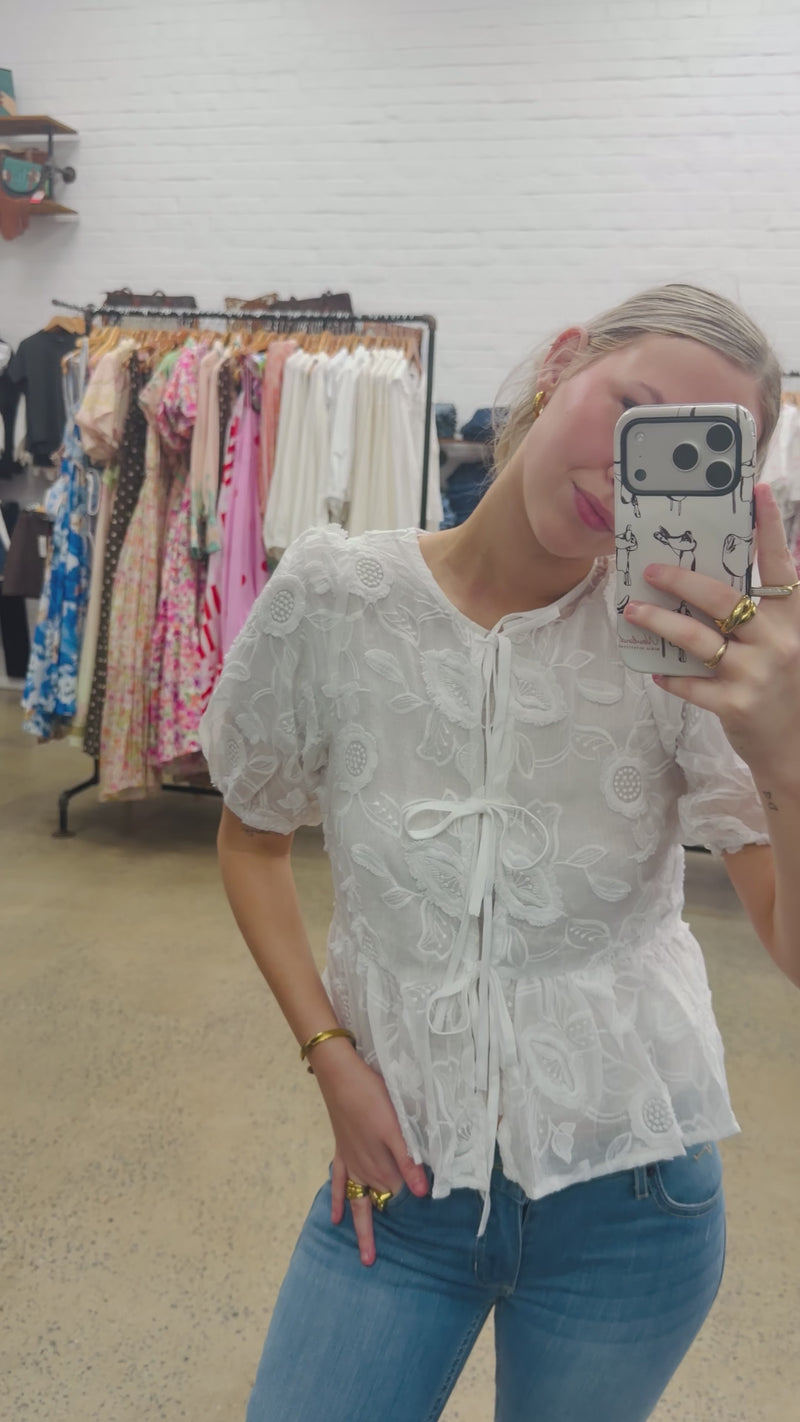 Ada is a STUNNING top that has a scooped neck line with three bows in the middle. Pemplem finish for that extra detail. This specific top has a sheer fabric with an embroided floral design. Made From: 100% Cotton.