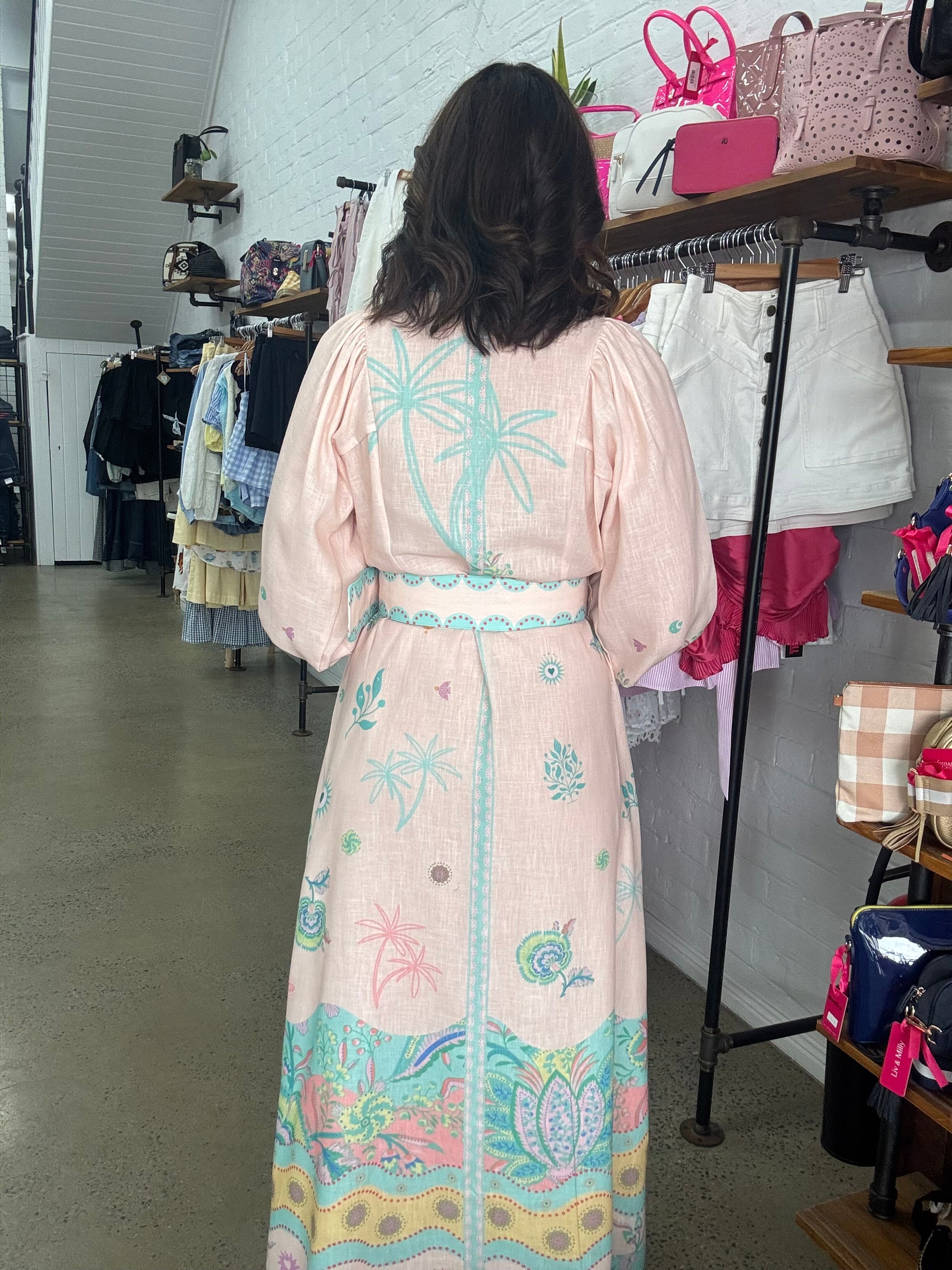 Sky is a stunning maxi dress that features a collar, puffy sleeves with button up cuffs and a full button front, she also has a beautiful tropical print, and a waist belt with belt loops to hold the belt in place. 70% Linen, 30% Polyester, 100% Cotton Lining