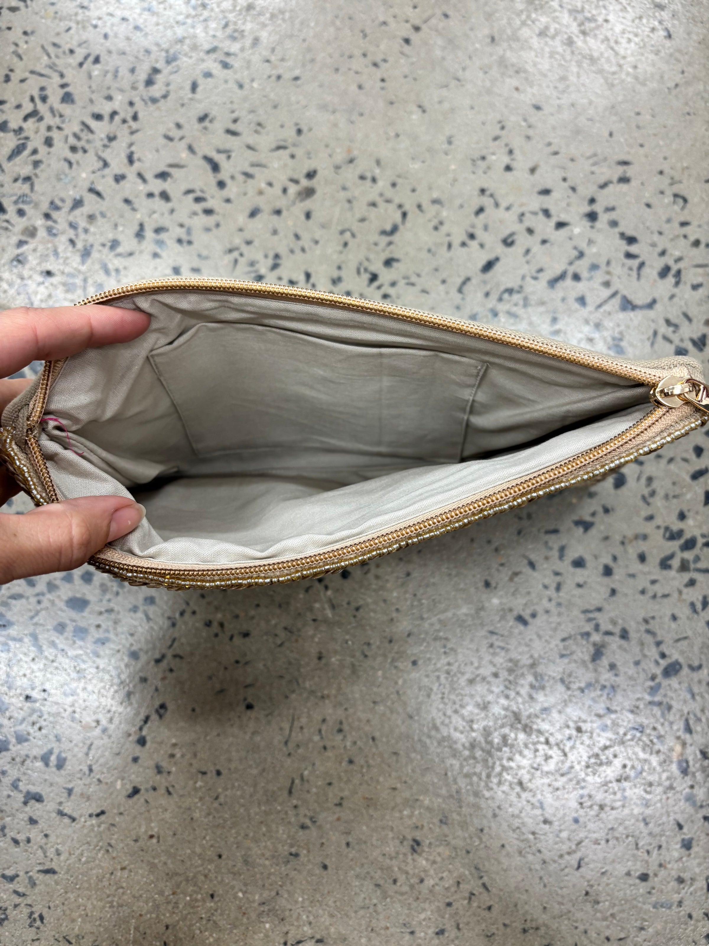 Add a pop of color to your look with our beaded clutch! Featuring a zip closure design and a subtle gold sequen all over and a vibrant wing on the front. Perfect for evenings out or special occasions, this eye-catching accessory blends playful charm with chic sophistication."