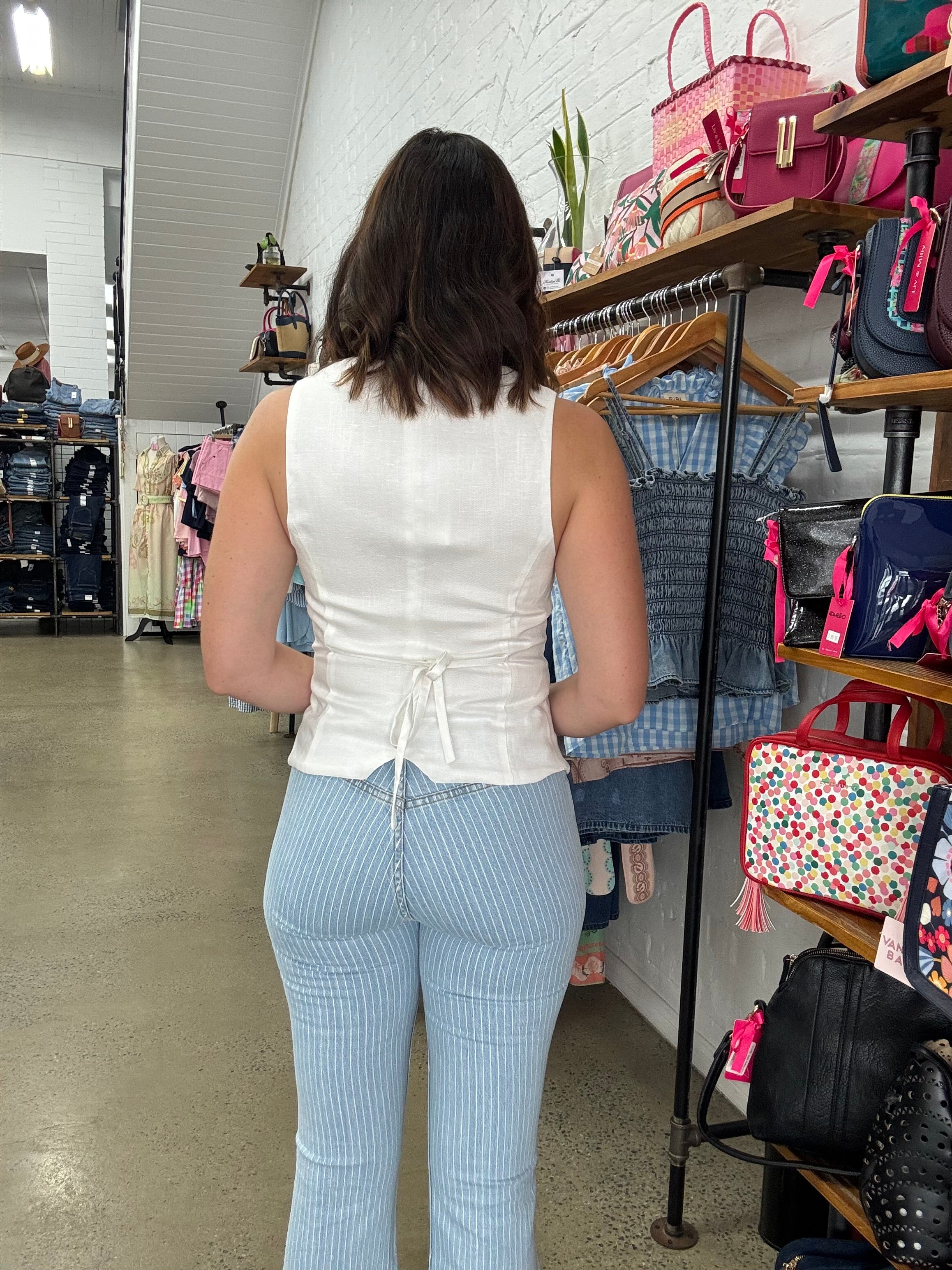 Aggie is a gorgeous vest inspired top that has a square neck line with buttons running down the front. Also features a tie on the back to help cinch in your waist. Made From: 75% Lyocell & 25% Linen.