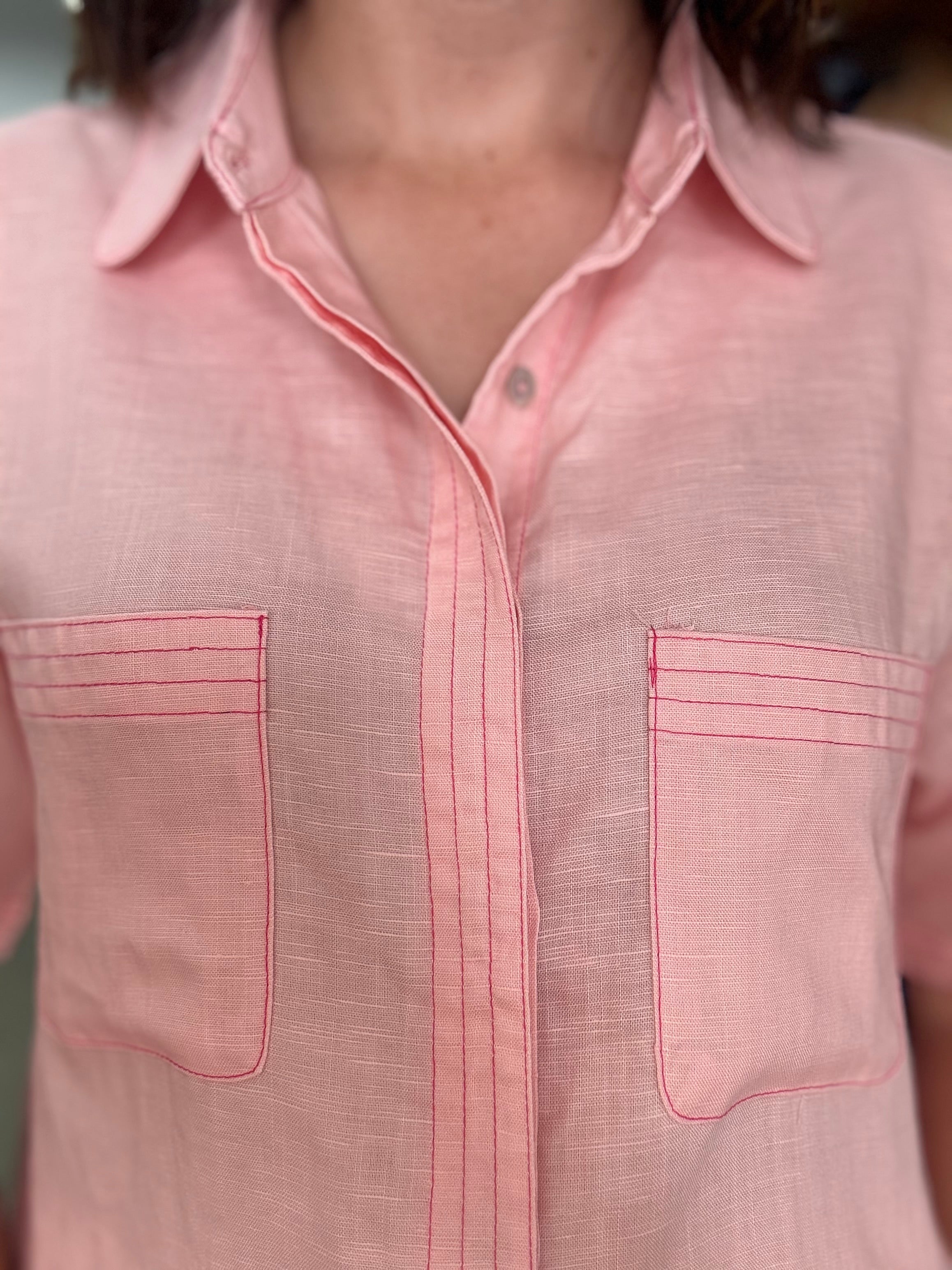 Brittany is a light pink top & short set with hot pink stitching. The top features a collar, short sleeves and fully button up front with pockets . The shorts feature an elastic waist with belt loops, two front pockets and side zip closure. 30% Linen 70% Lyocell