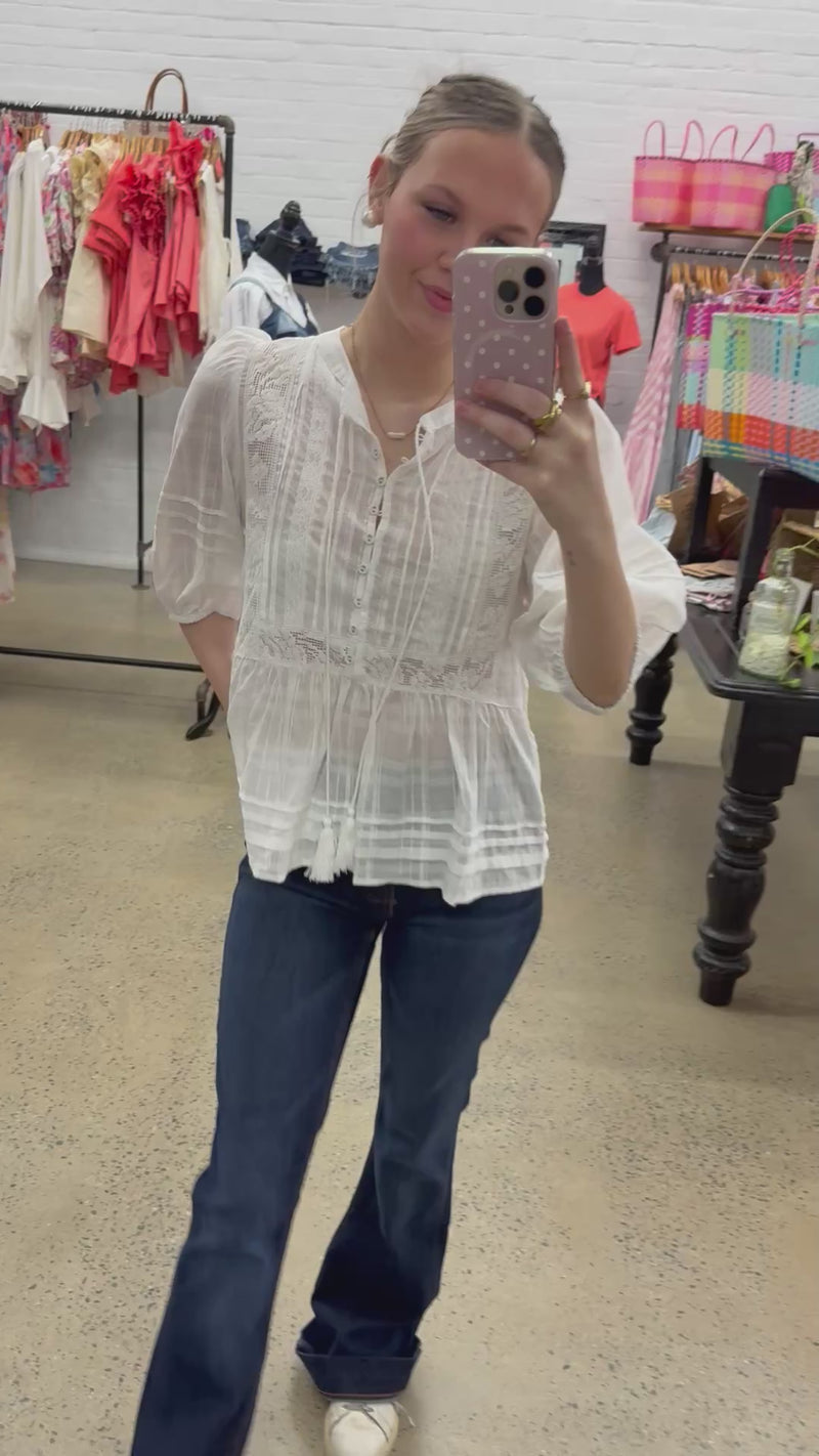 Cecilia is a gorgeous short puff sleeve top with elastic cuffs featuring lace detail and a button up mid section and tie up tassles. 100% Cotton