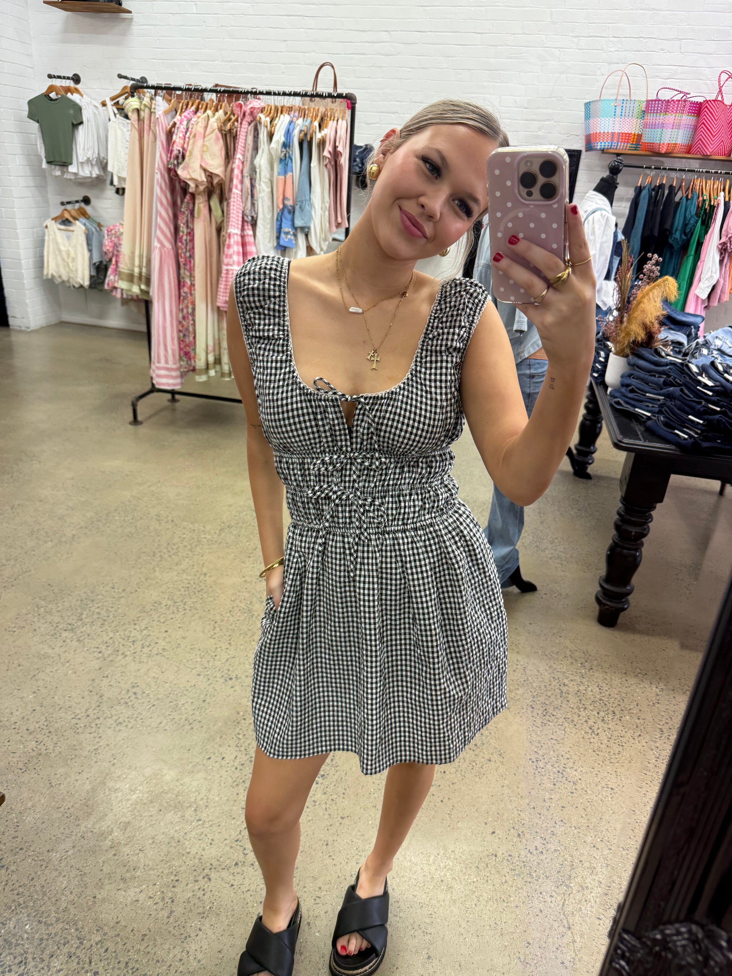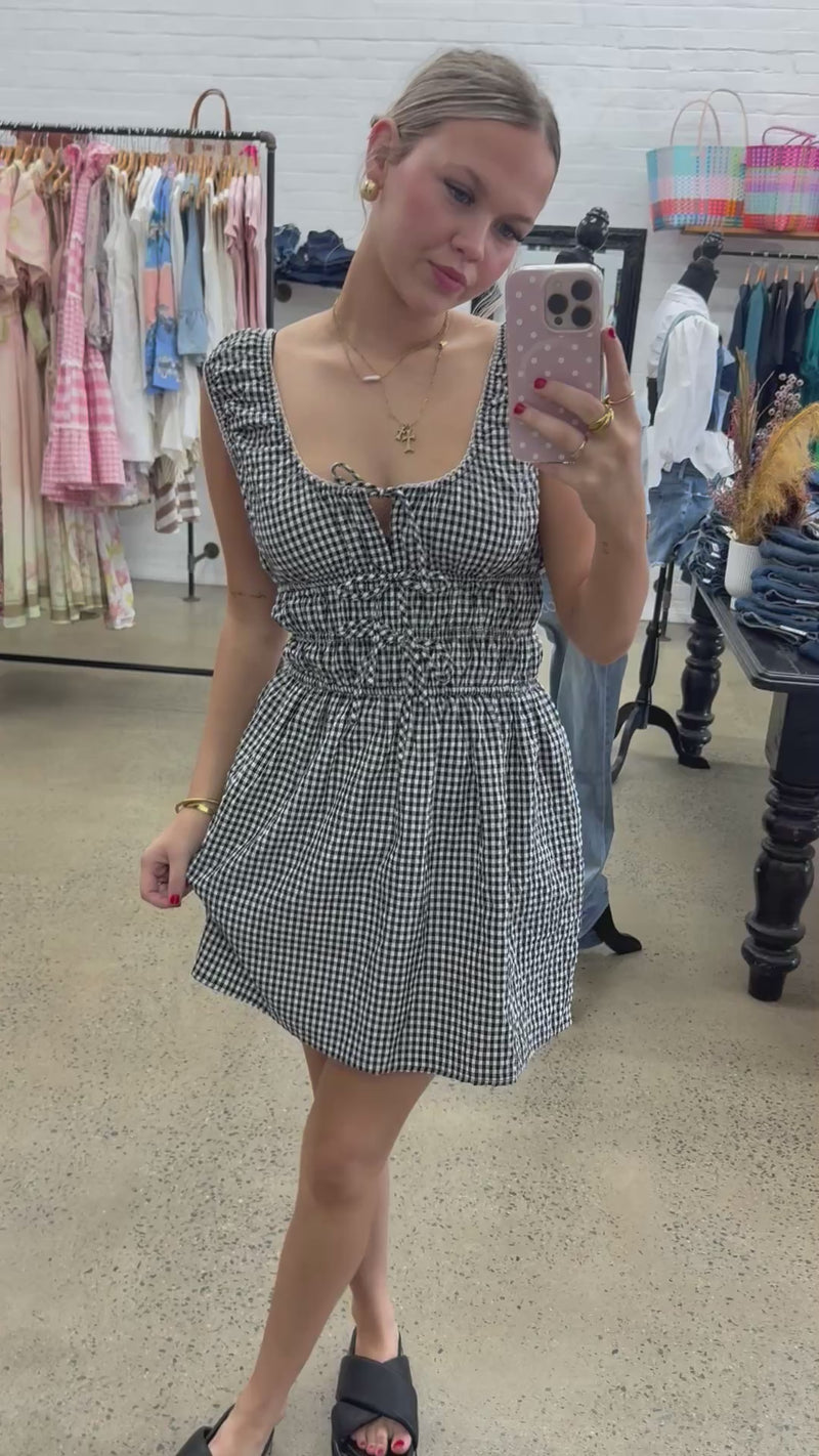 The Charli Mini Dress is a stunning black and white gingham featuring three simple tie up bows at the front and white piping on the sleeves. Made from 100% Polyester