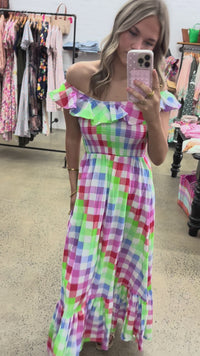 Koda is a cute midi dress featuring an elastic shirred bust with a frill neckline detail in a vibrant rainbow gingham. Made From 100% Cotton.
