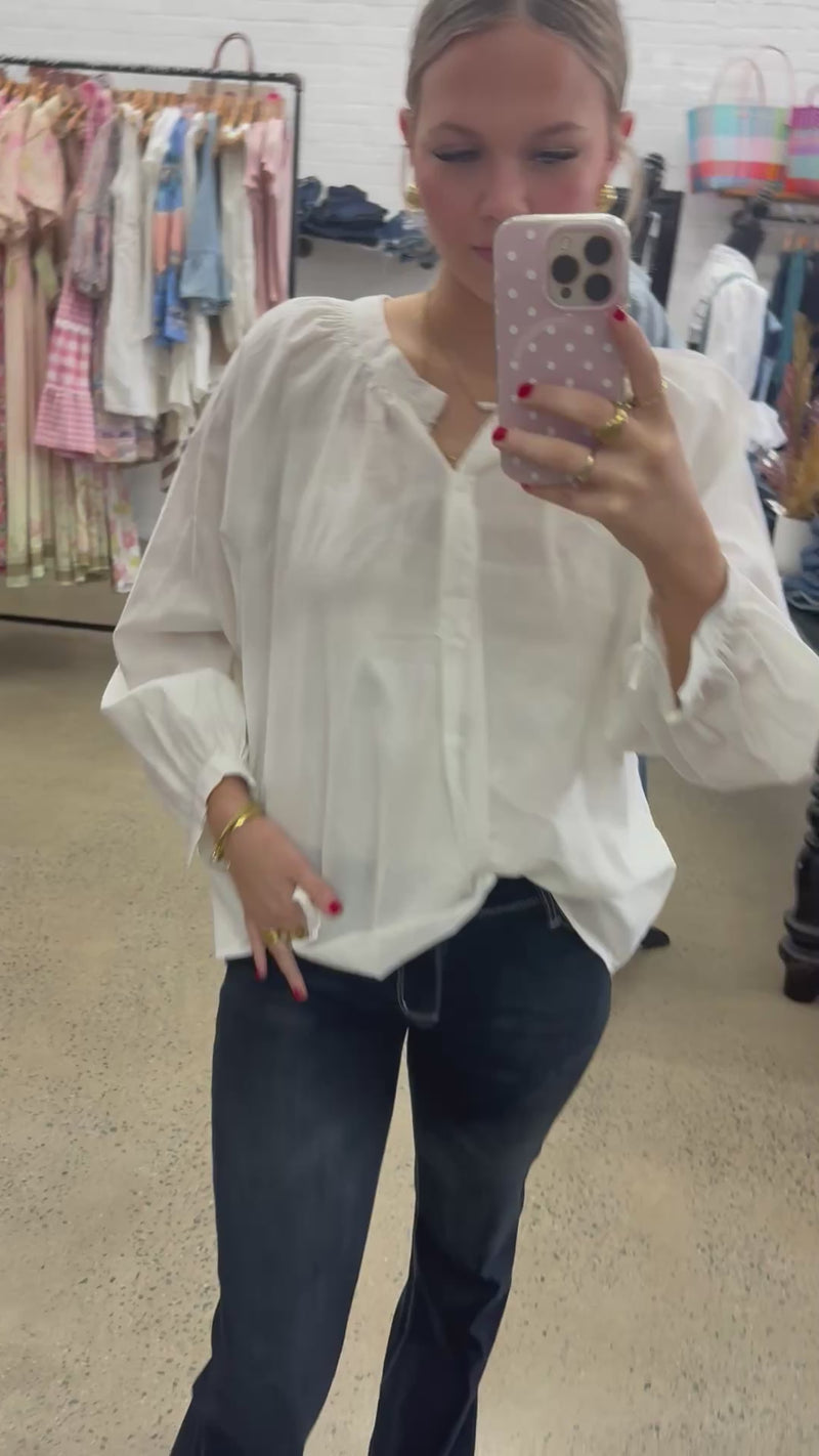 The Ryda Top is a beatiful long sleeved half button blouse, featuring slight shirring at the top of the shoulders. Made From 100% cotton