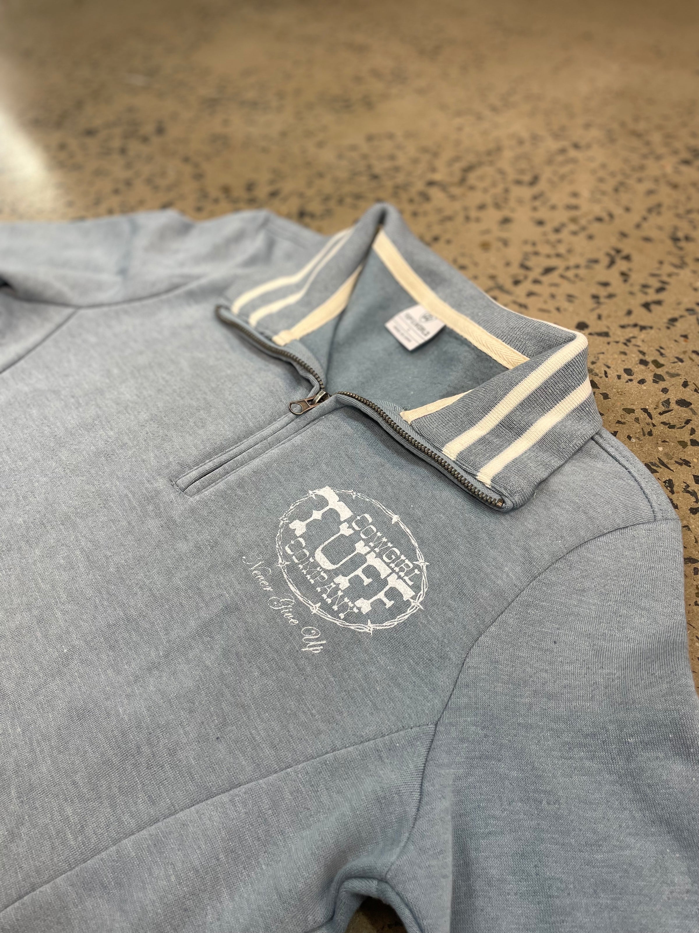 Cowgirl Tuff Jumper, featuring a short collar, zip down the bust and CGT stamp on shoulder. 50% Polyester, 38% Cotton 12% Rayon