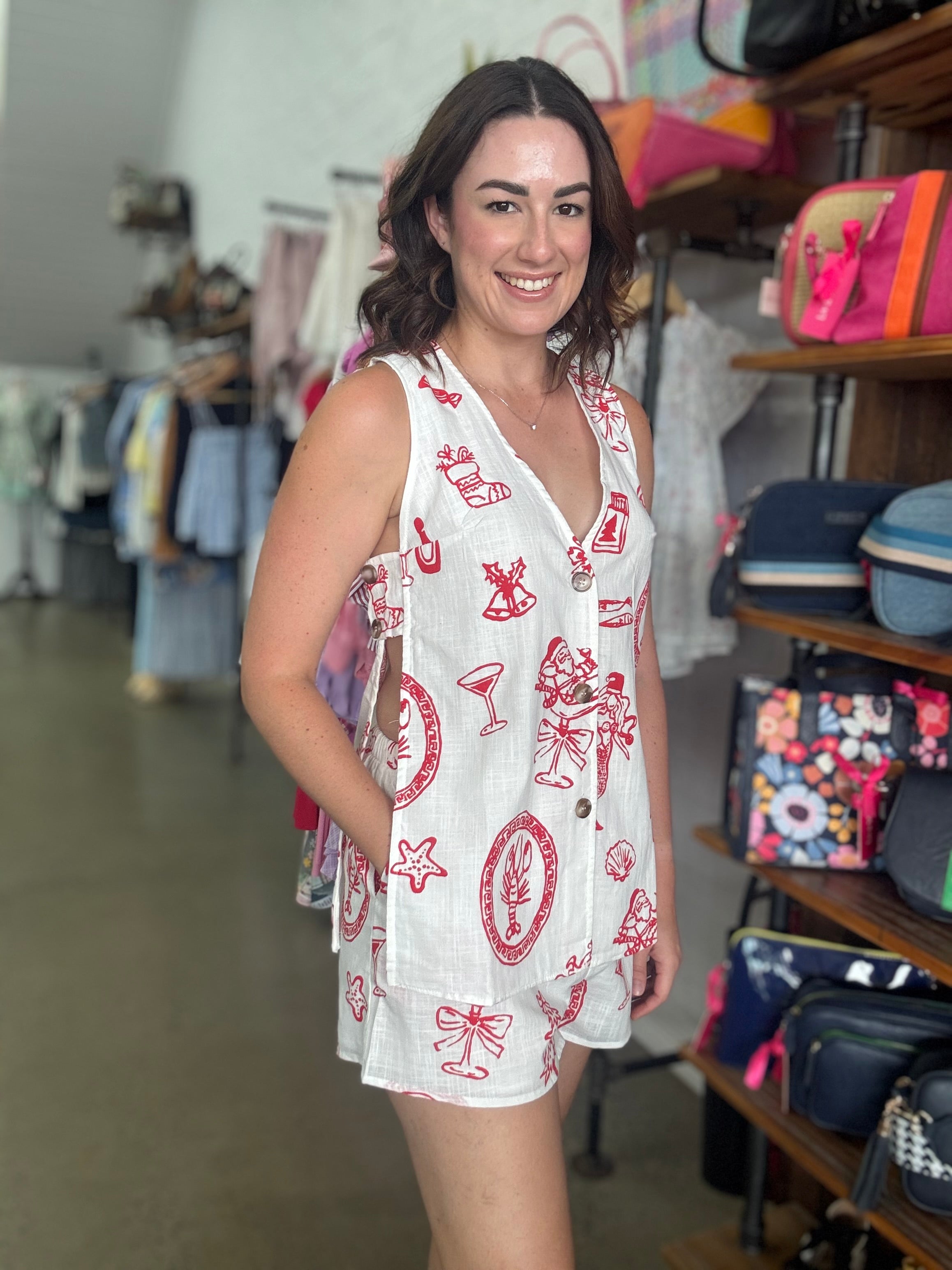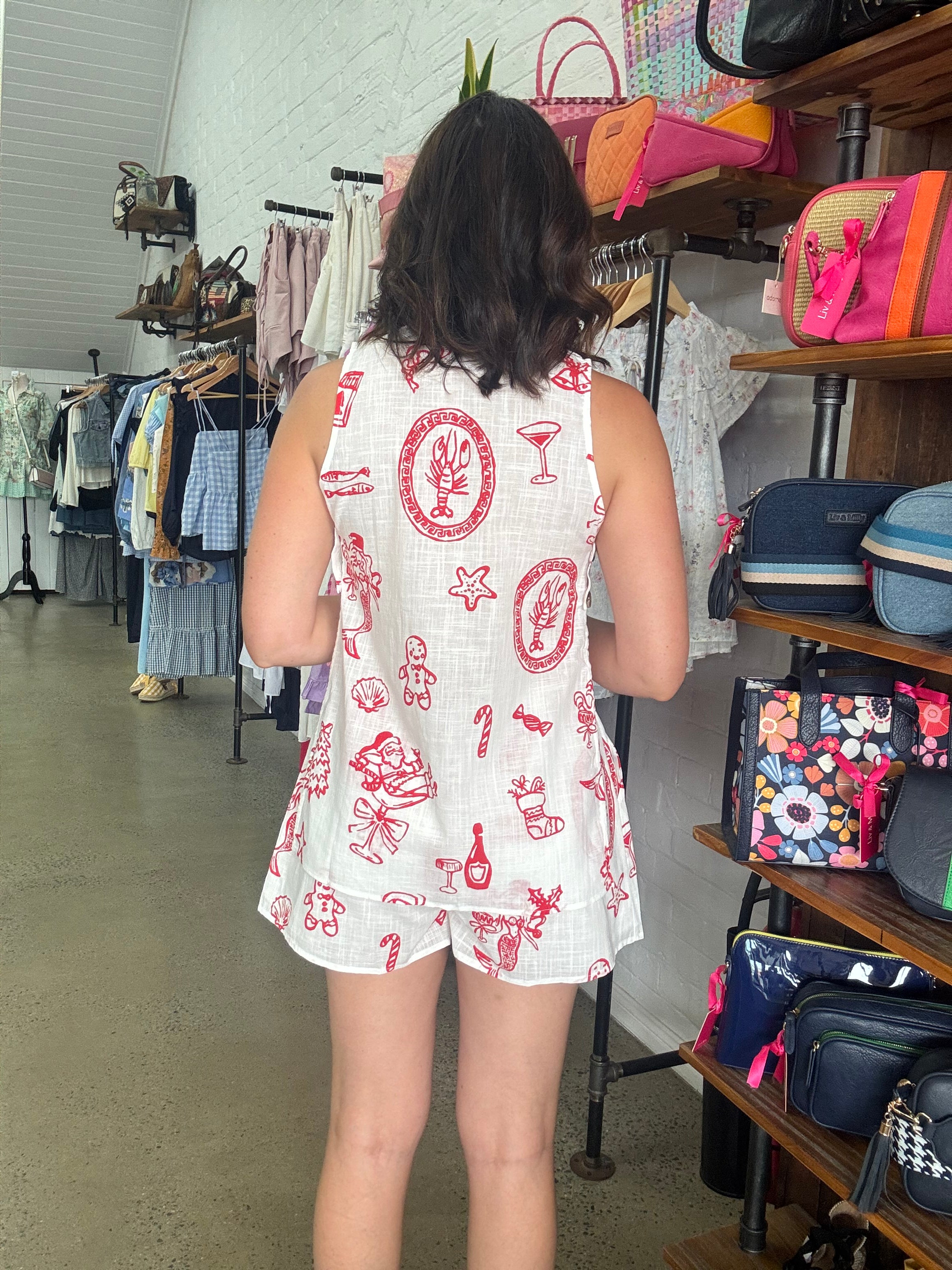 This festive set is a fun Singlet & Short set finished with in a christmas print. The top is a singlet style with three buttons at the front and two buttons on either side. The shorts feature an elastic tie up waist with pockets. 100% Cotton.