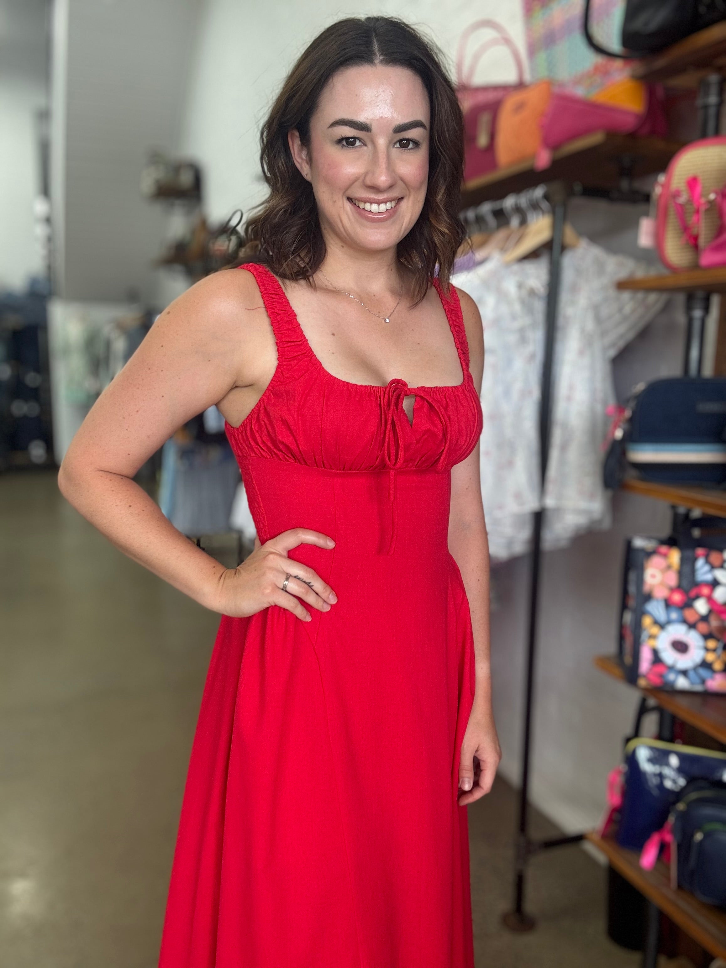 Mavis is a stunning maxi dress featuring thick elastic straps, a fitted waist and a square neckline with a functional tie detail. Made From 40% Viscose 40% Linen 10% Cotton 10% Polyester.