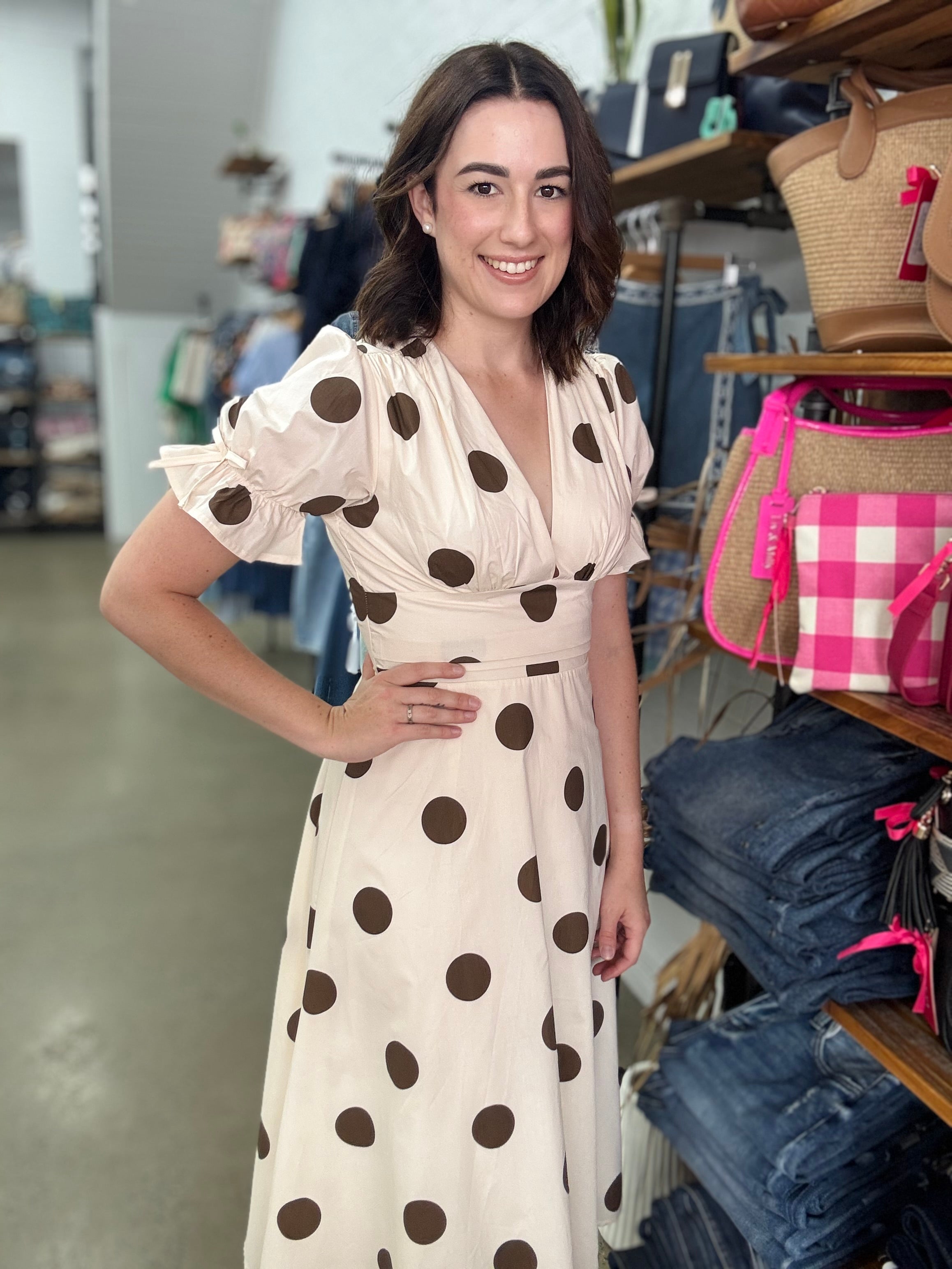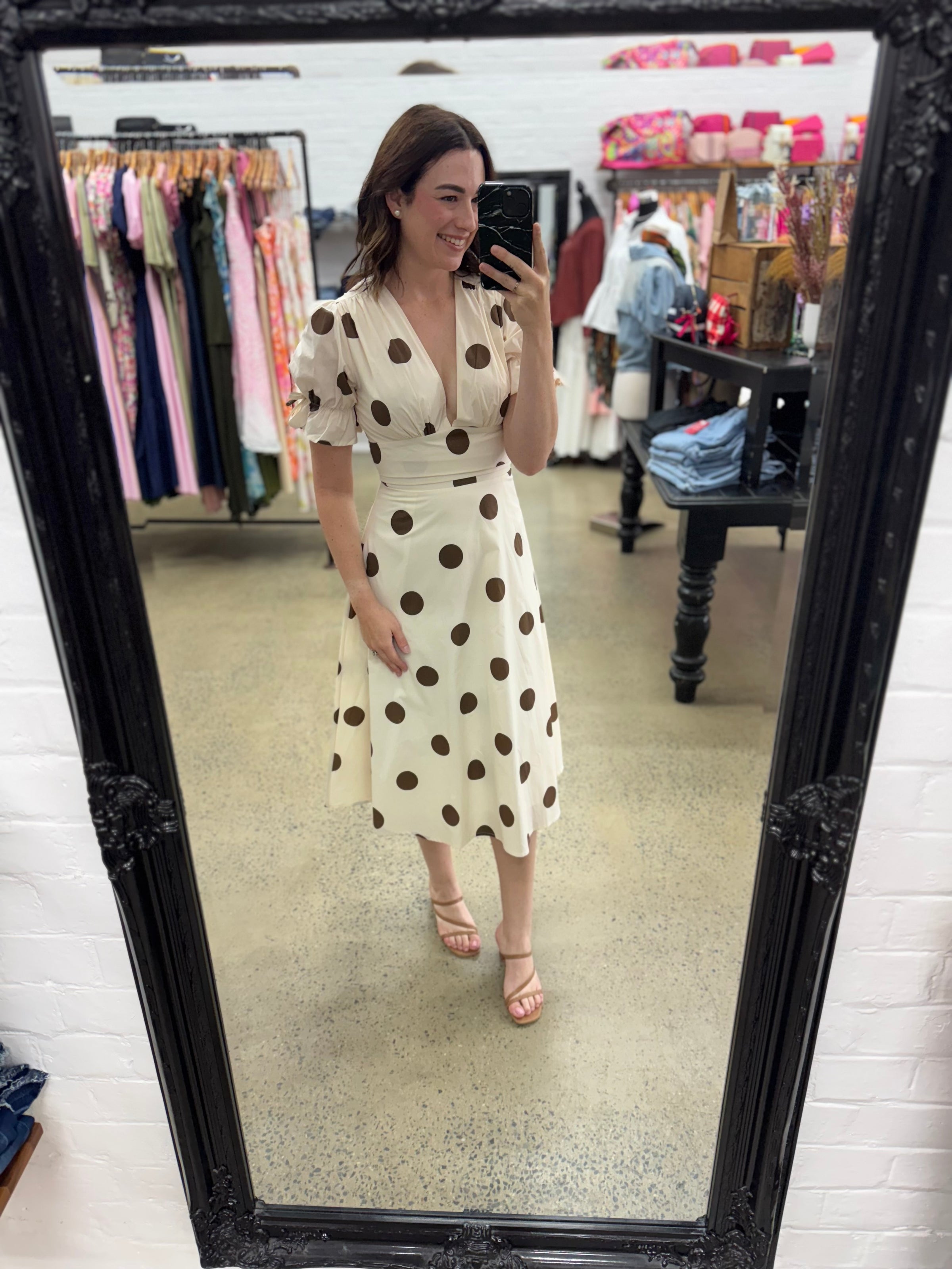 Callie is a cream midi dress featuring bold chocolate-brown polka dots. It has a v-neckline, elasticised puffy short sleeves and an empire style waist. Outer: 100% Cotton, Lining: 100% Rayon.