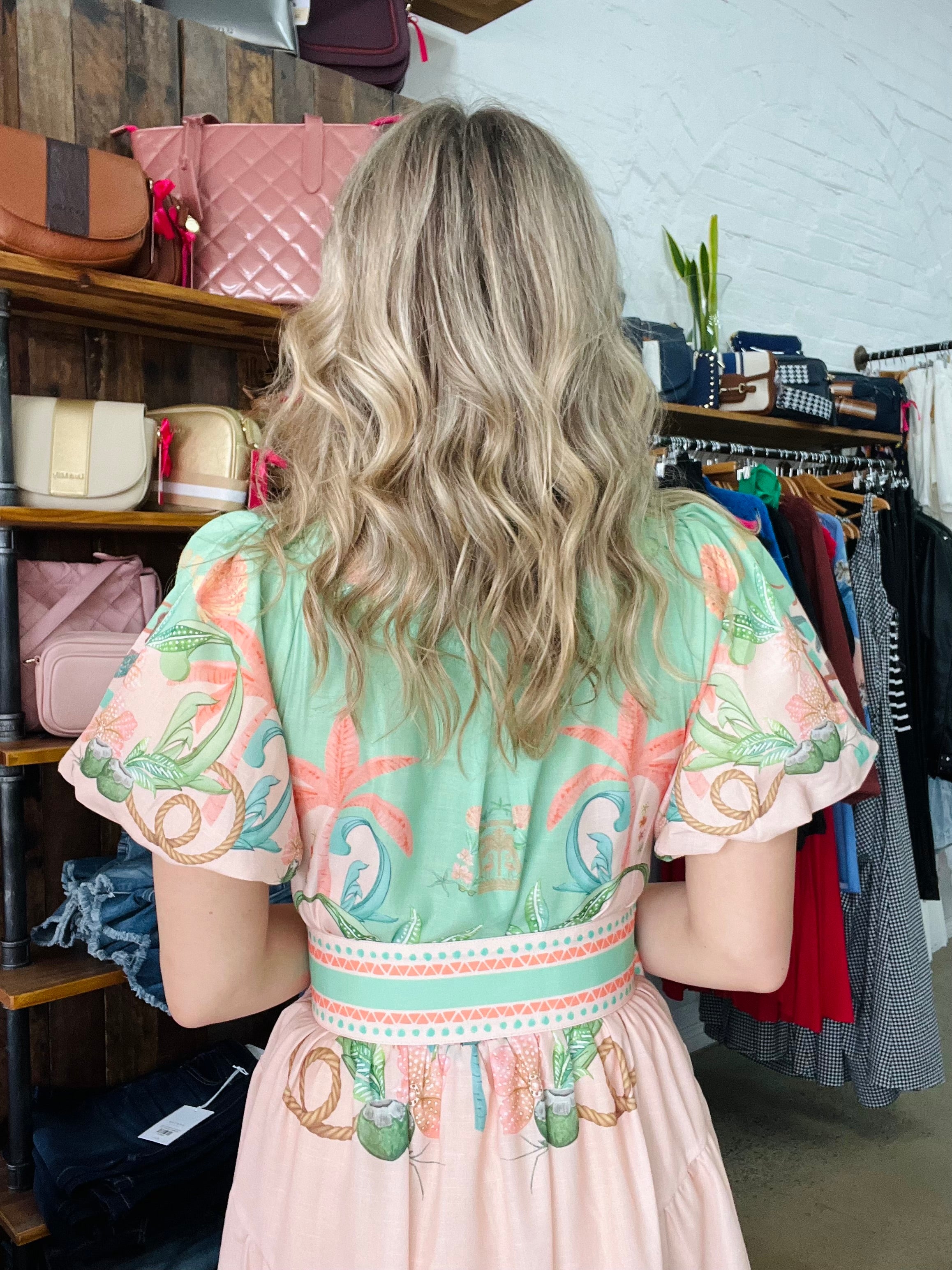 Kaylia is a sweet button up maxi dress with a collar, matching waist belt and short puffy sleeve with elastic cuffs. Made From: 60% Cotton, 15% Polyester, 25% Rayon.