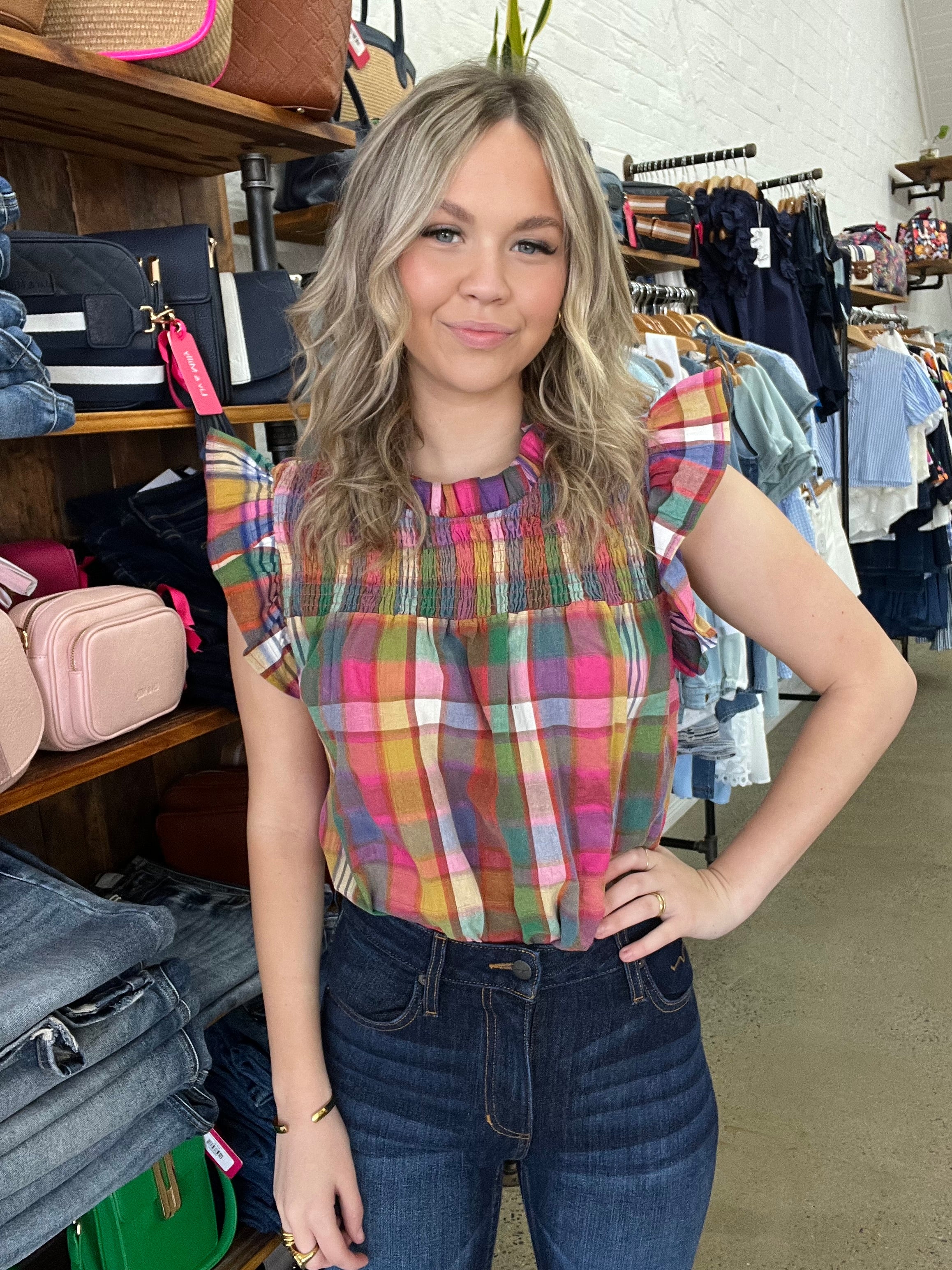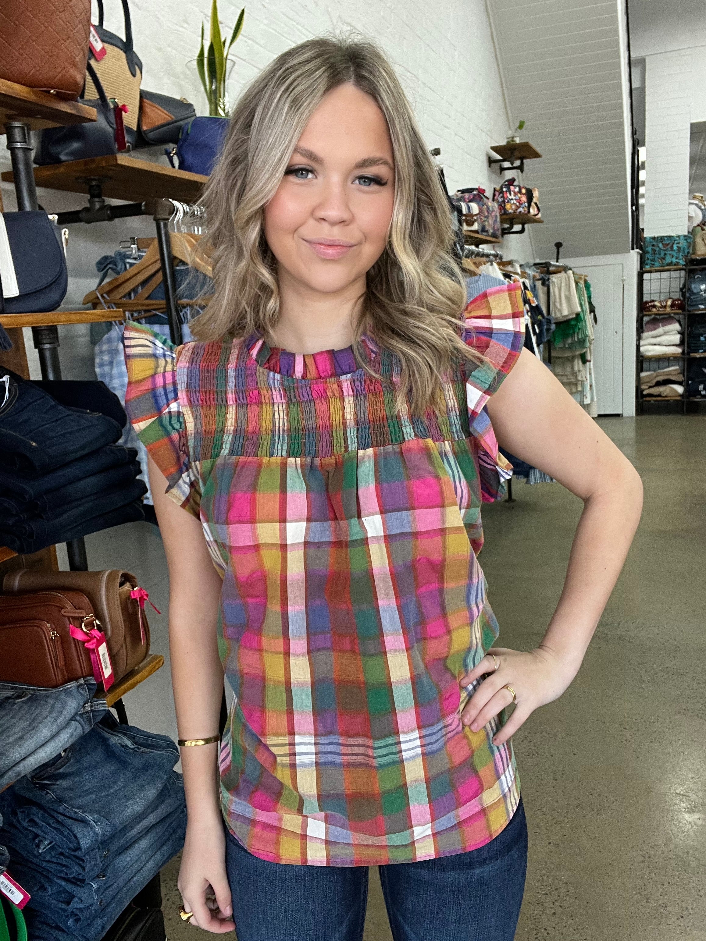 Gwen is a unique ruffle sleeved top that has a highneck-line and ruching along the bust. Featuring a vibrant, vintage check pattern throughout. Made from: 100% Cotton.