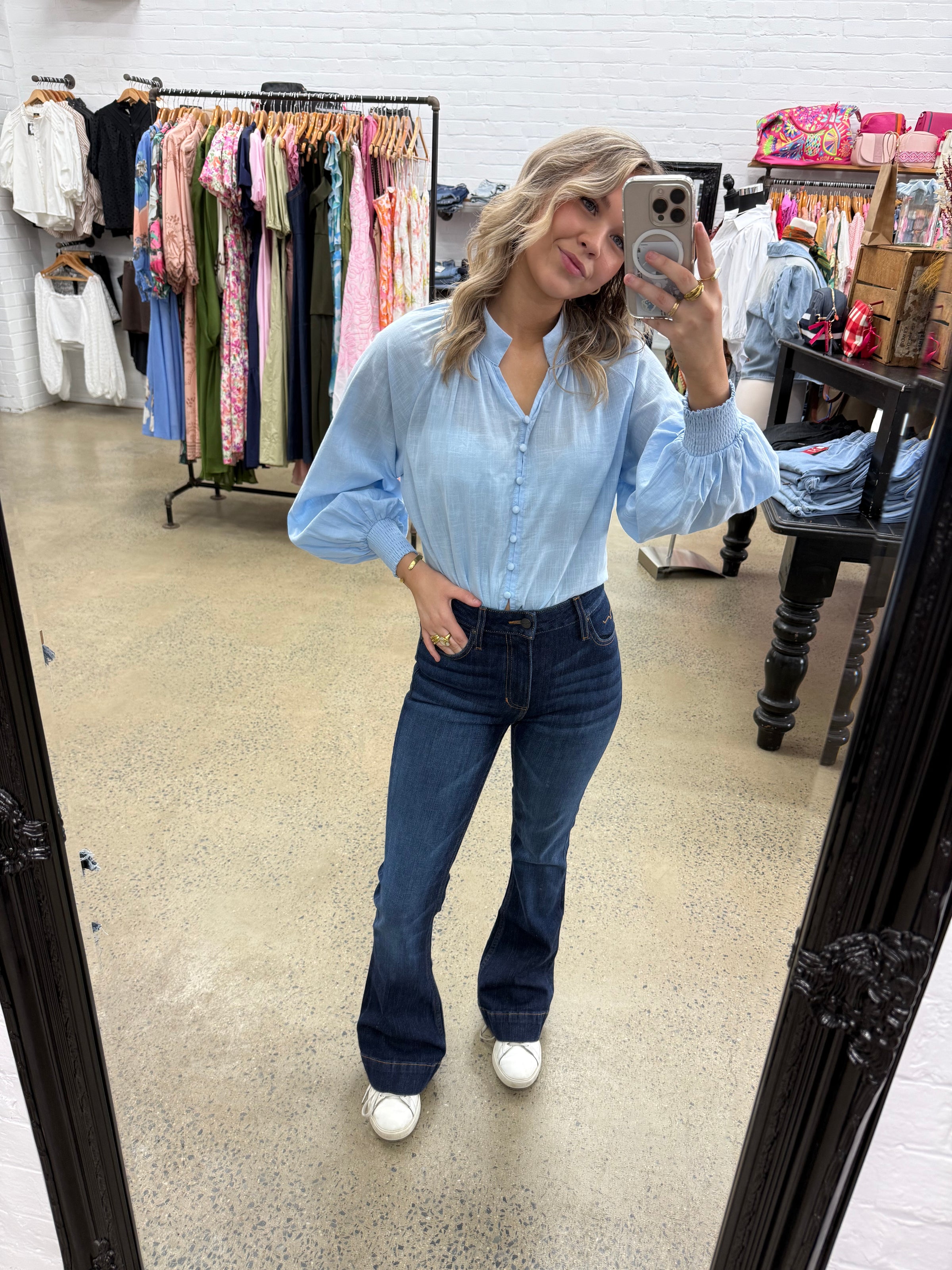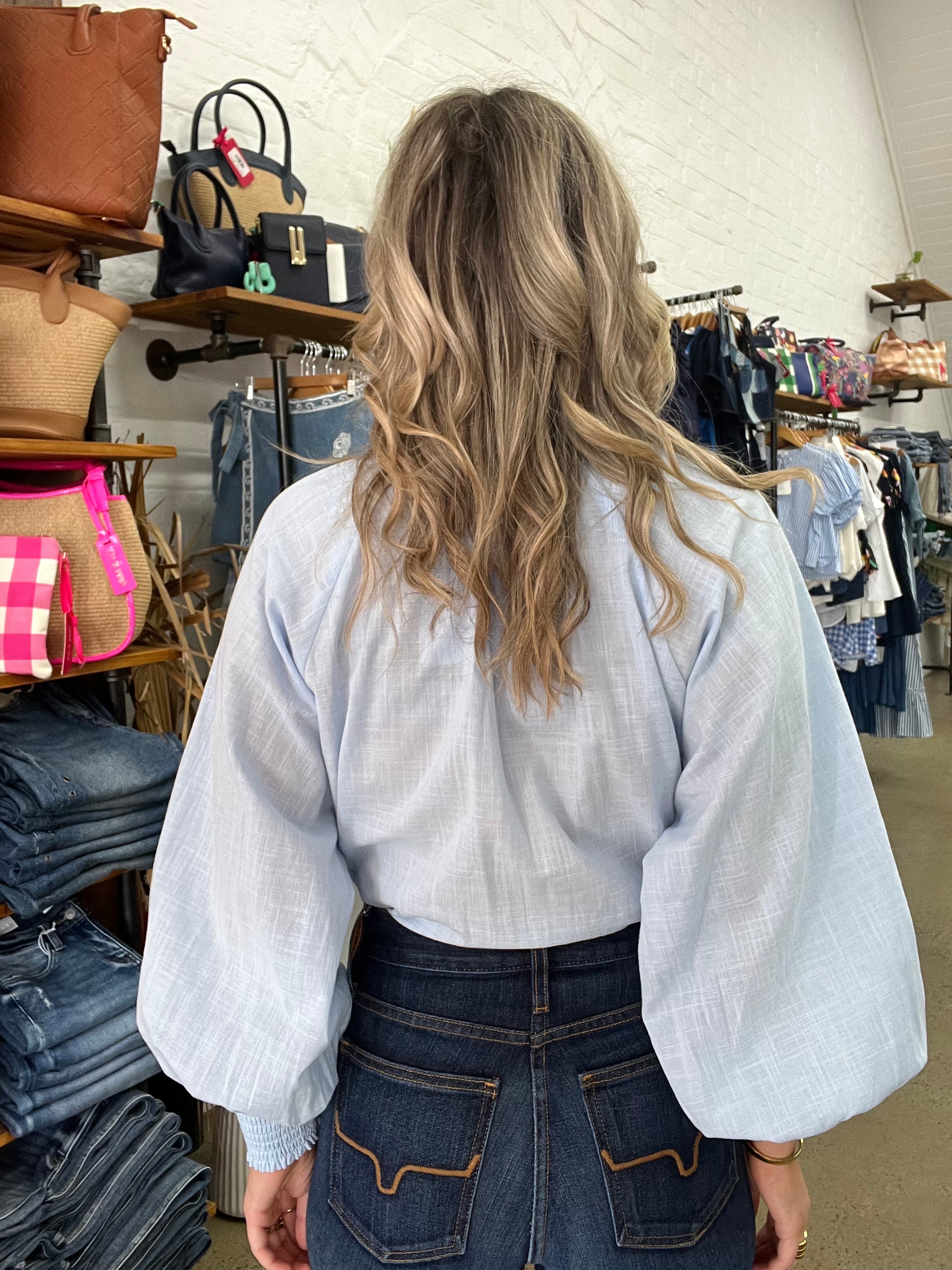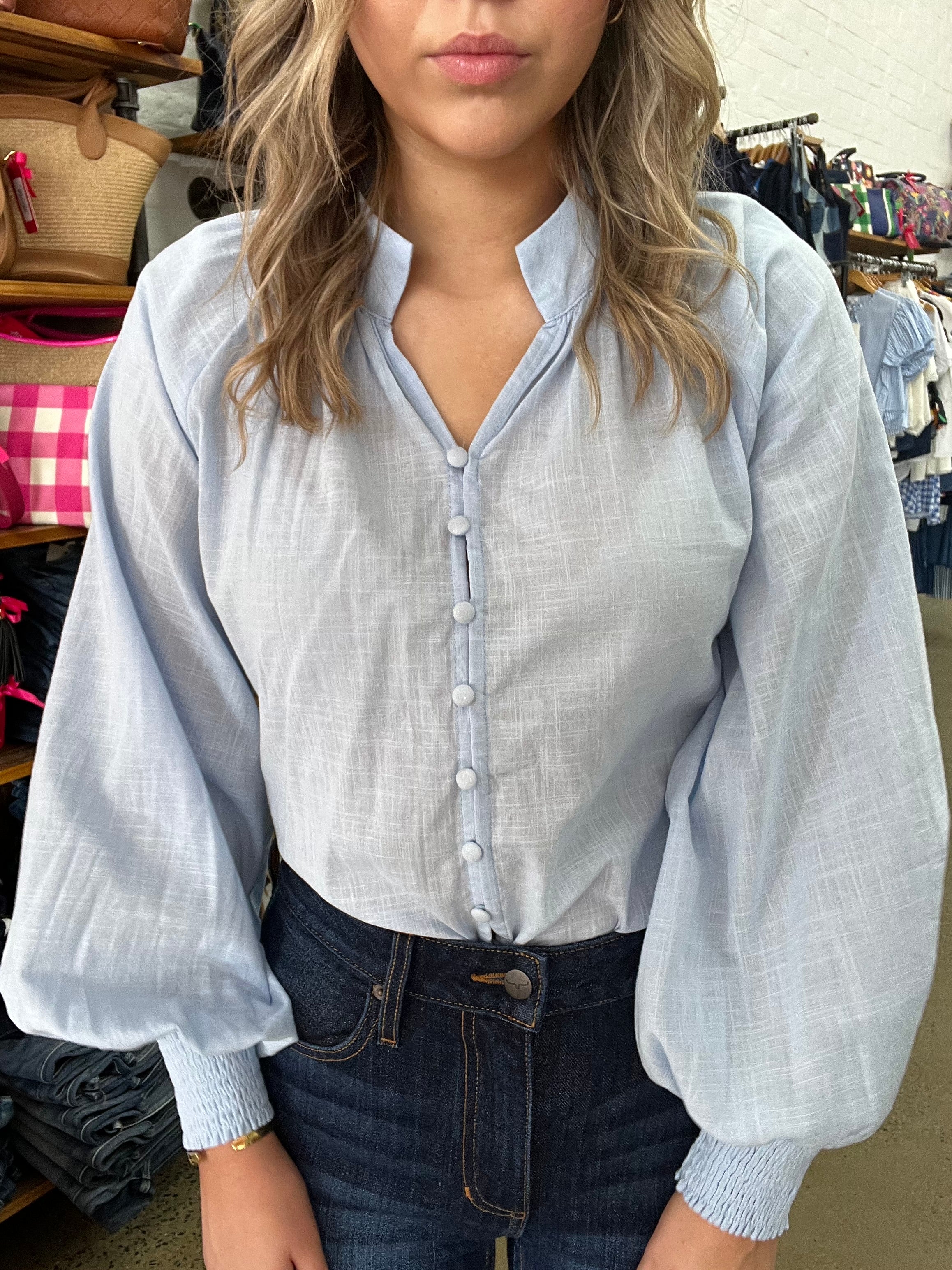 Ledger is a gorgeous, long sleeve top that features a full button down closure, a v-neck and ruched cuffs on the sleeves. Made From 100% cotton.