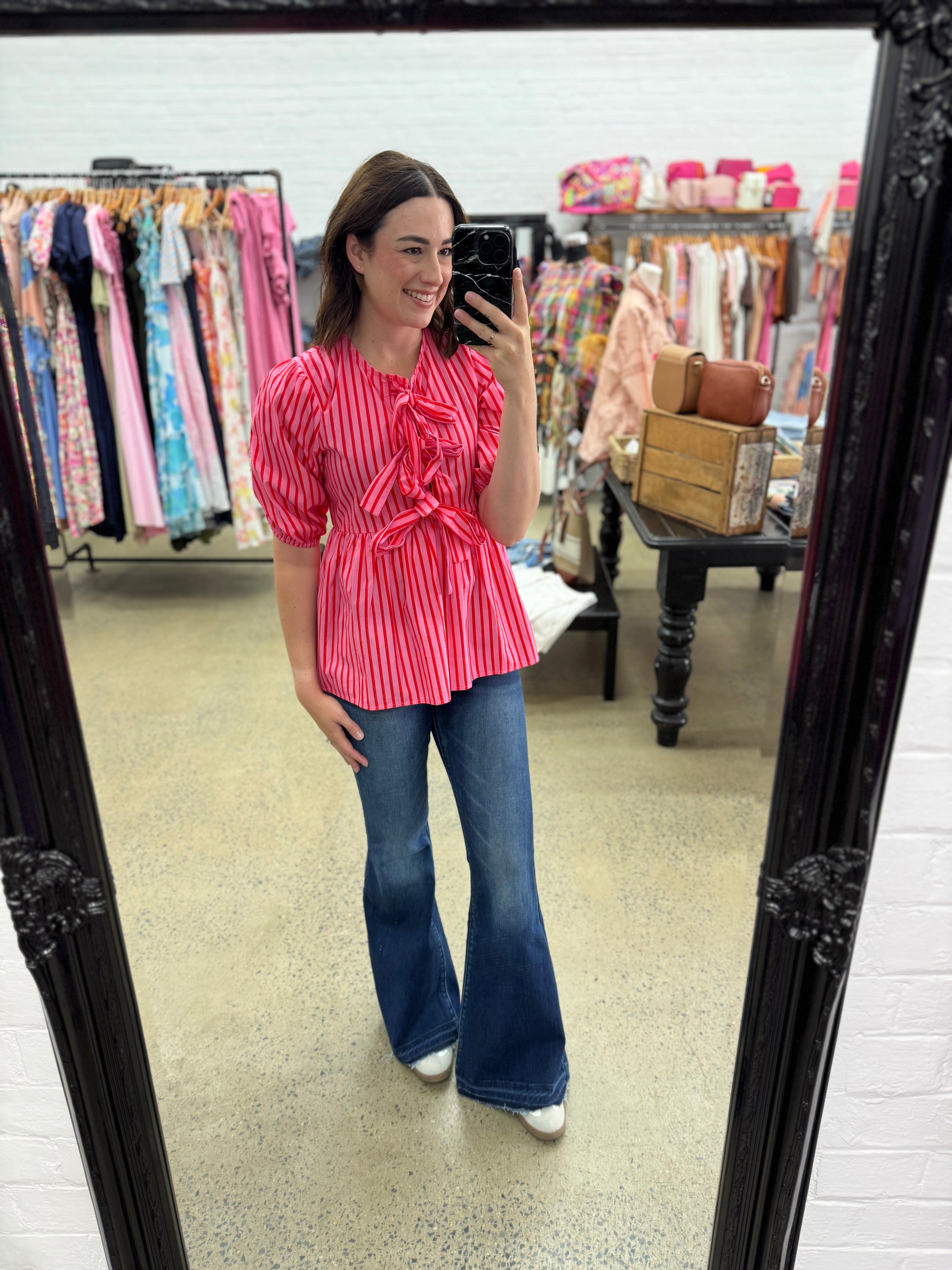 Monet is a stunning three bow tie up front, striped long sleeve top with a peplum bottom. Made From: 100% Cotton.