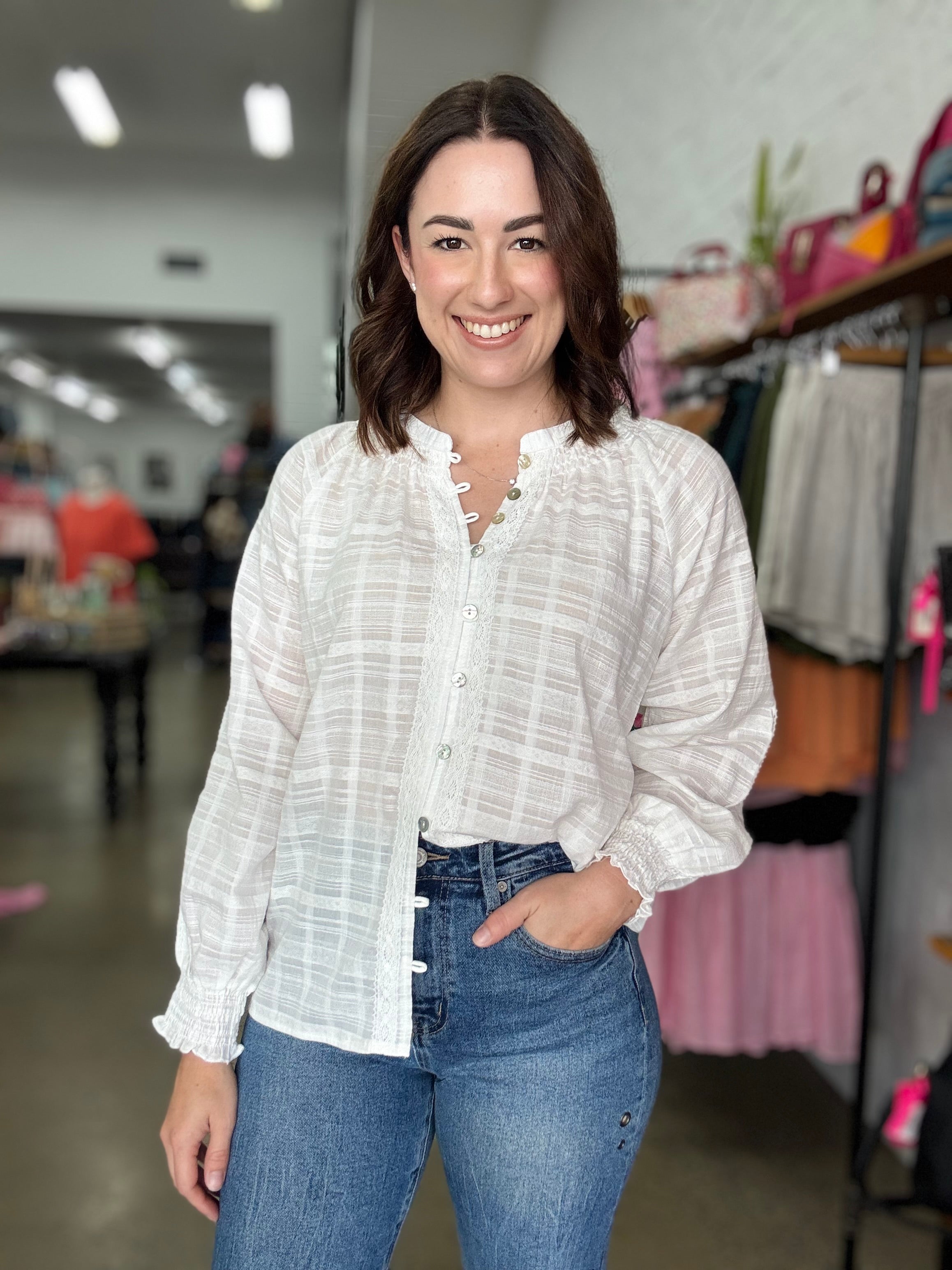 The Polly Top is a beatiful long sleeved full button blouse, featuring lace trimming down middle of shirt and along the top of the sleeve.