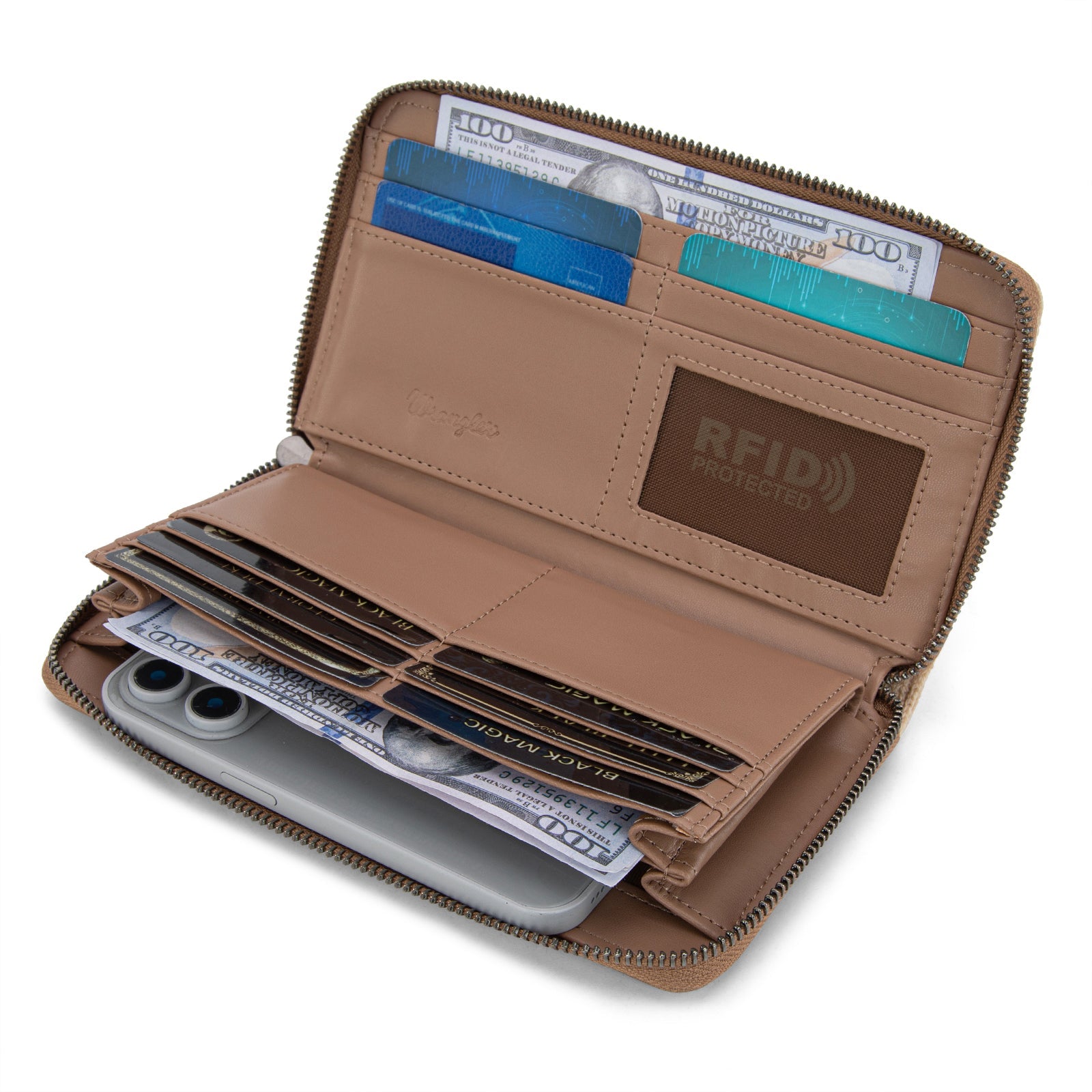 - Single removable strap to convert the wallet into a wristlet