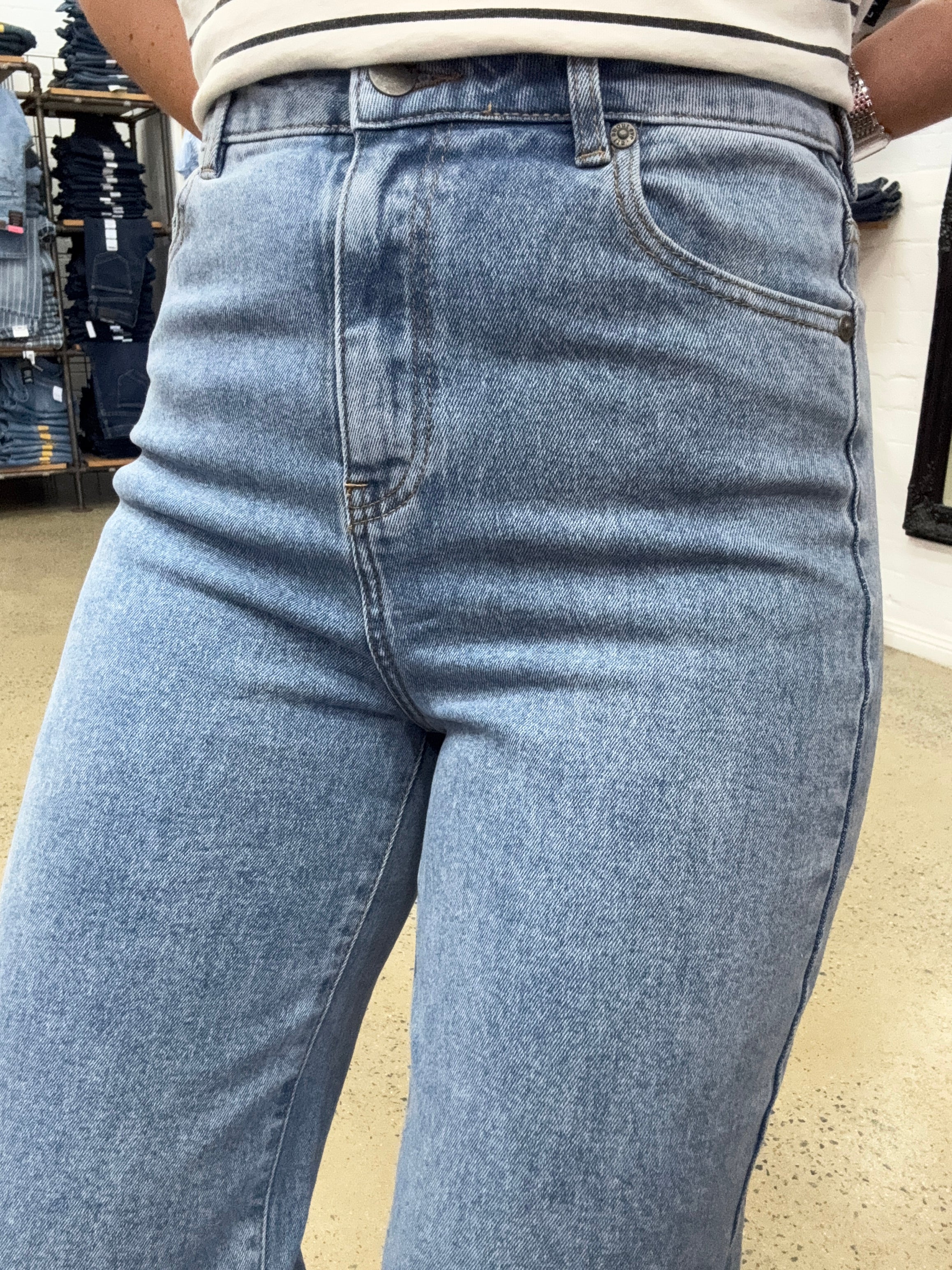 FIT - This jean is a High Rise and will sit above your belly button at the front and a little higher at the back.