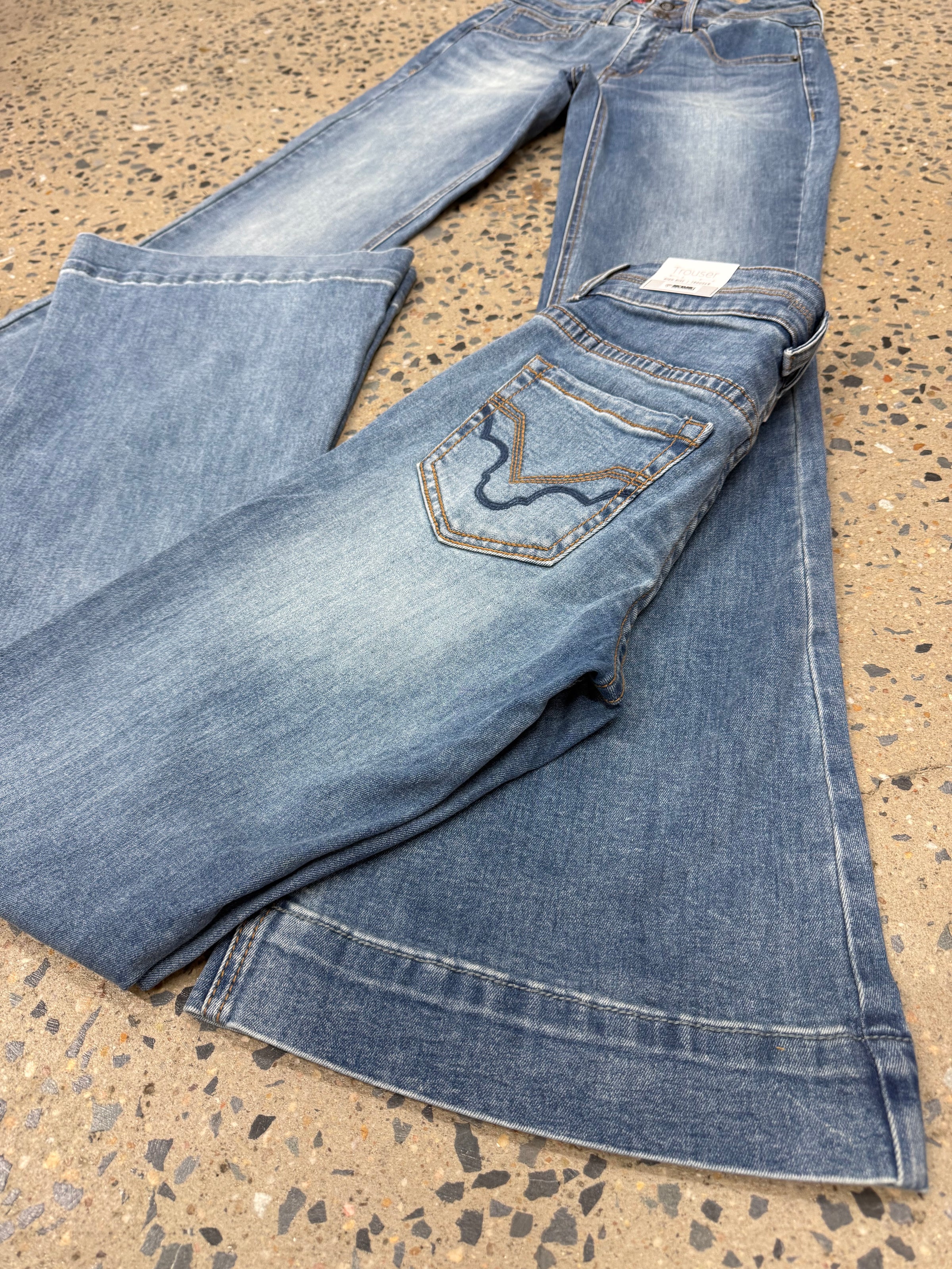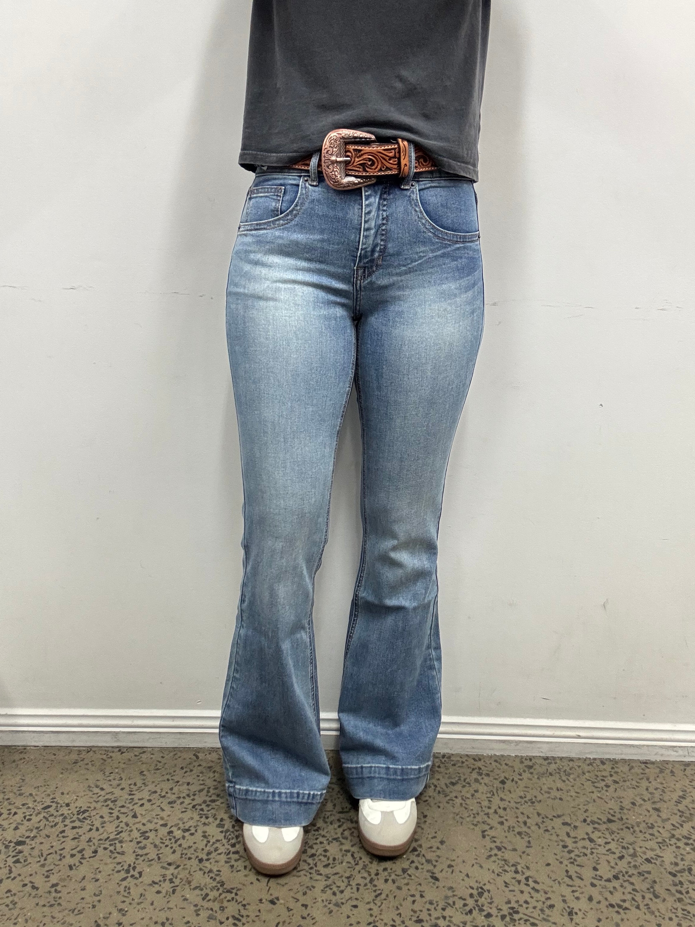 Rock & Roll high rise trouser in a light wash denim, featuring stitched back pockets and a double waist band.