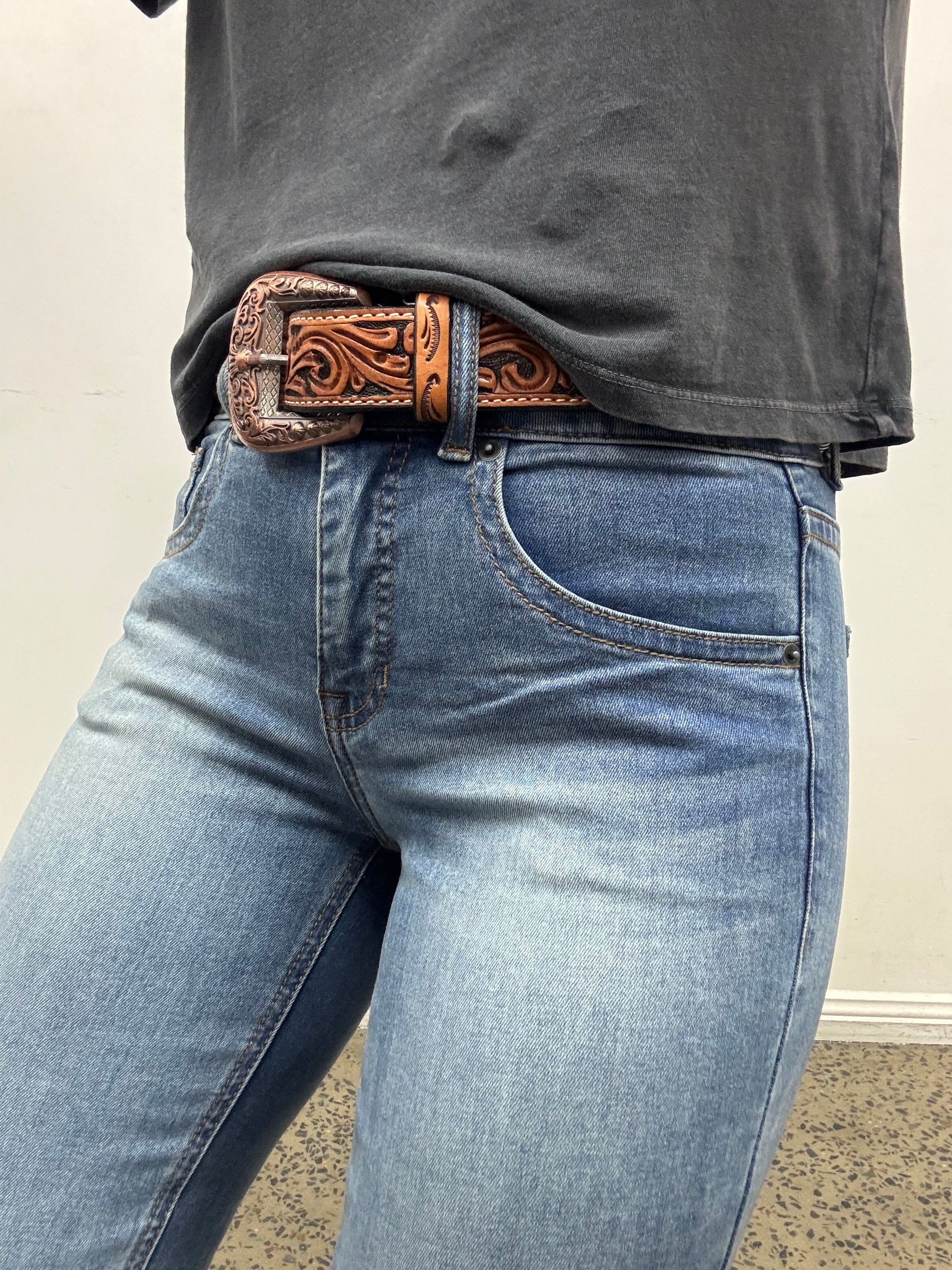 LEG LENGTH - Leg length of jeans is always the second number in jeans size for example a 25/34 is a waist size 25 with a 34 inch leg length. If trouser cut/flare jeans are longer than the actual length of your leg, unlike bootcut, you don't get 'scrunch' you get 'drag'. Because they are wide at the bottom they won't sit up on your boot, they will sit over it so anything longer than the actual length of your inside leg is going to drag. We recommend if you want a flare/trouser jeans for riding to go longer and cuff the bottom hem up when walking around. To work out the length you need for dress jeans just measure your inside leg from croutch to the floor in inches. If your leg measures 32 get a 32, if it measures 33 get a 34 etc.