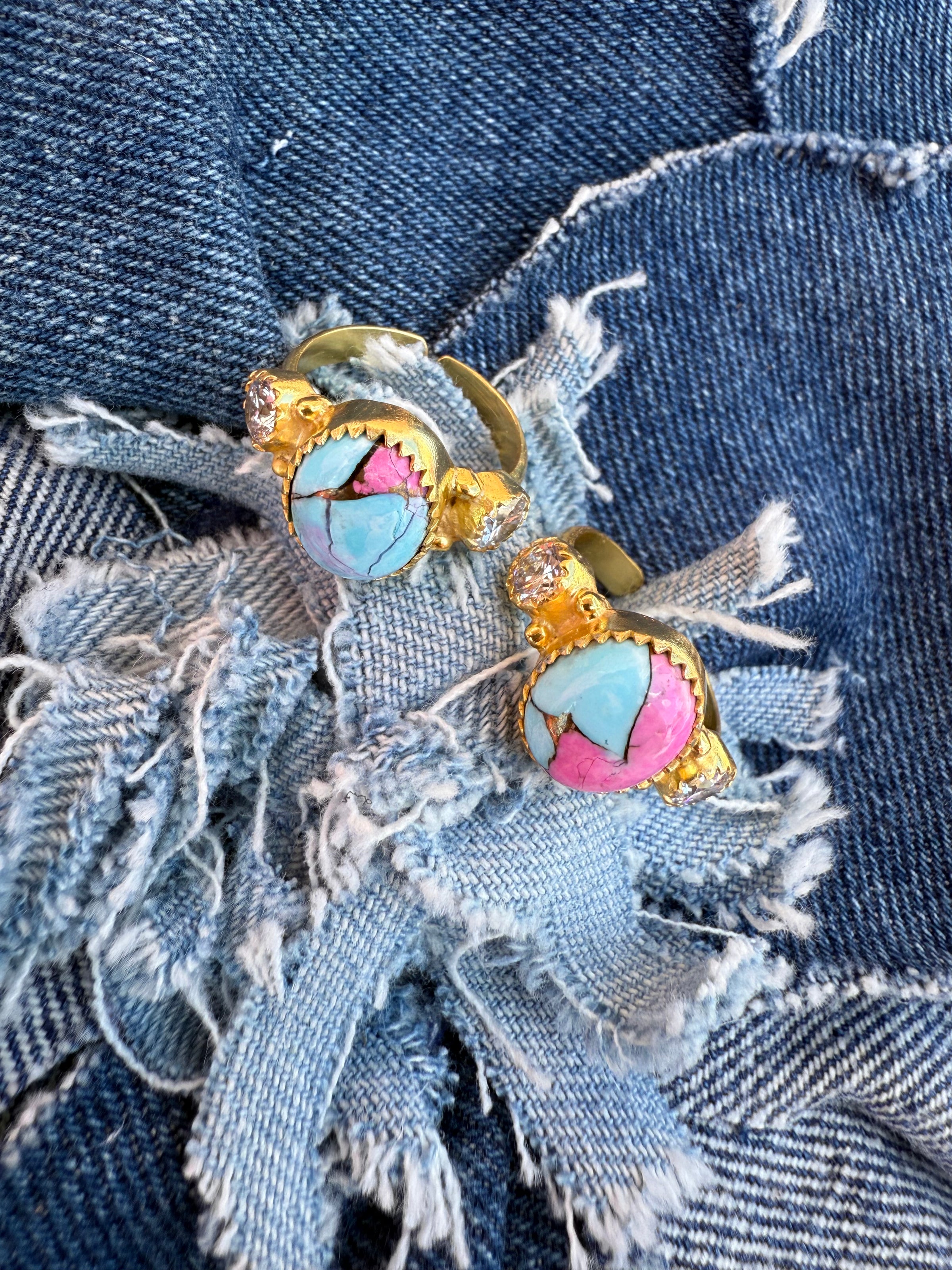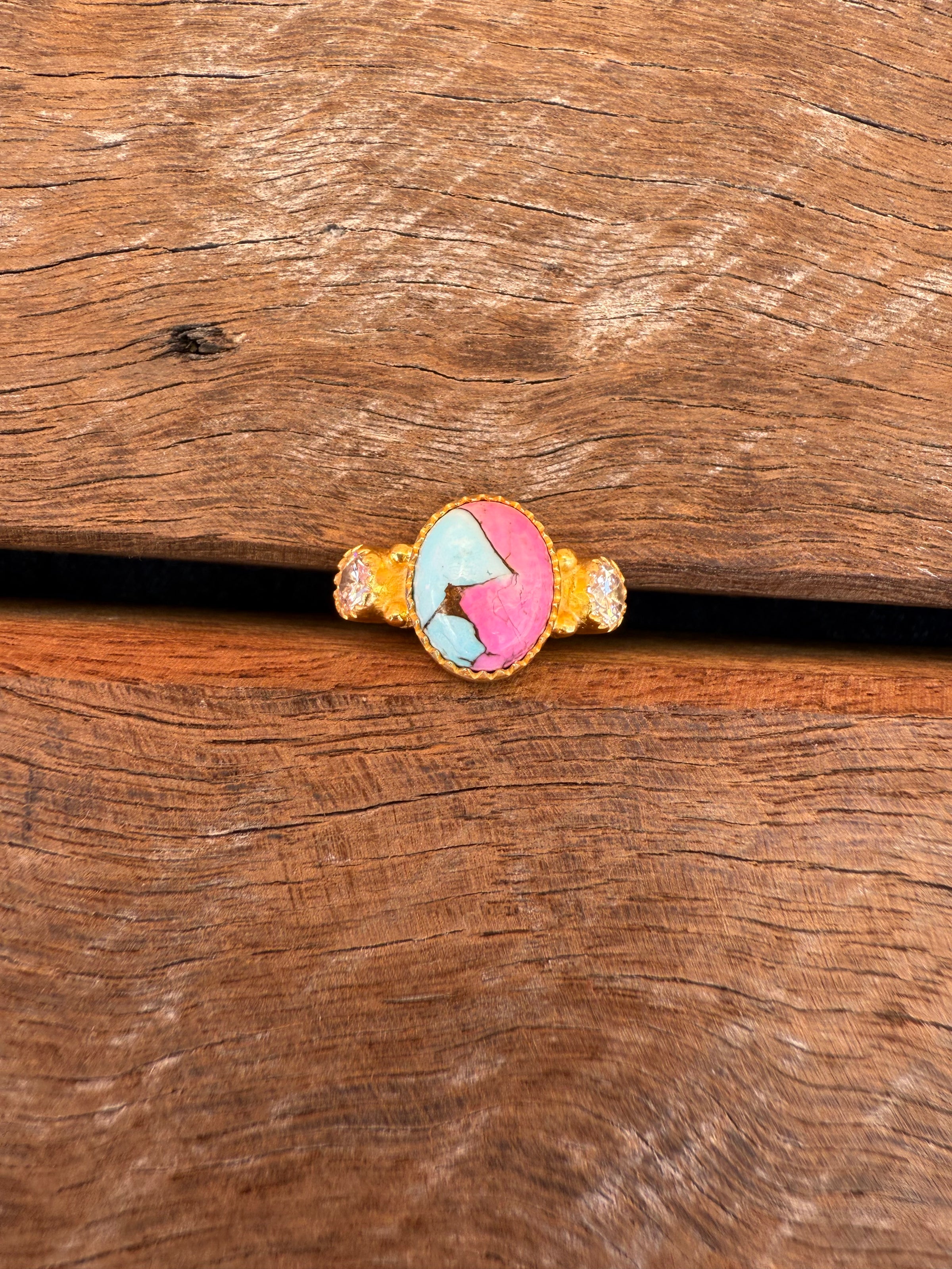 Elevate your style with this handcrafted adjustable ring, featuring an authentic Cotton Candy Dahlia Stone set in gold plated sterling silver. Each piece is stamped for authenticity, showcasing artisan craftsmanship and timeless Southwestern charm.