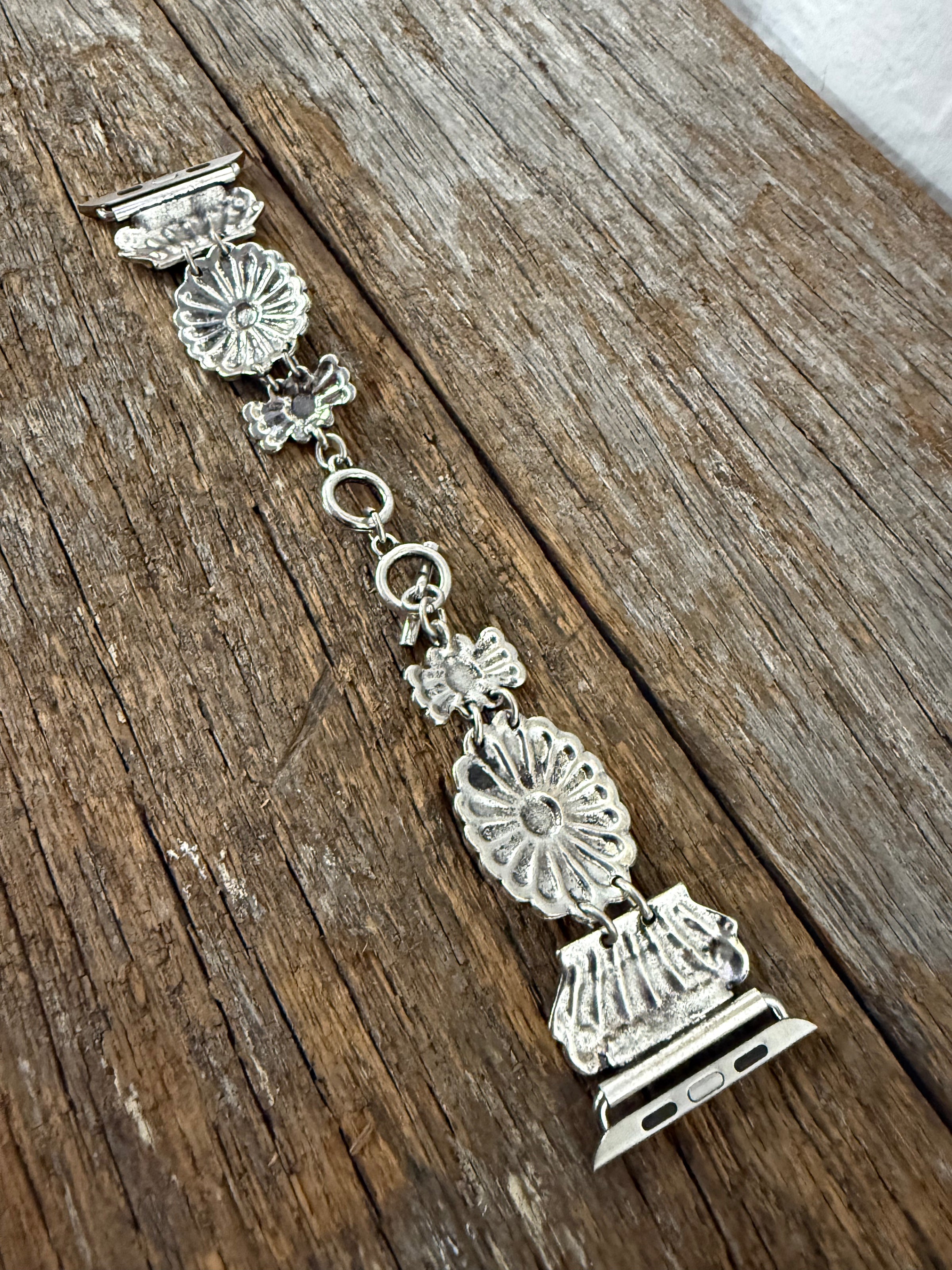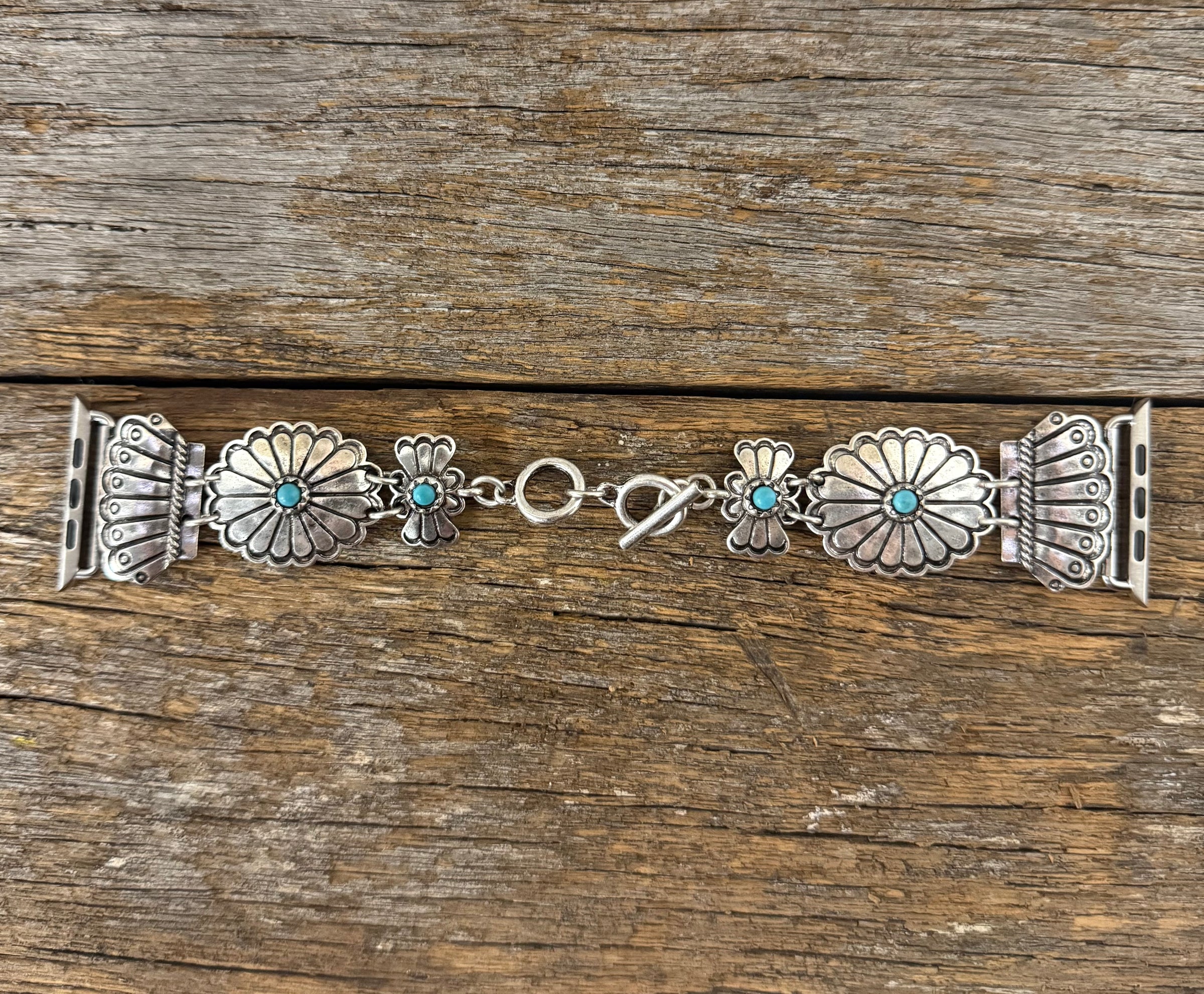 Silver turquoise watch band to suit Apple watches, combining timeless southwestern charm with modern tech. Available in two sizes to suit face sizing.