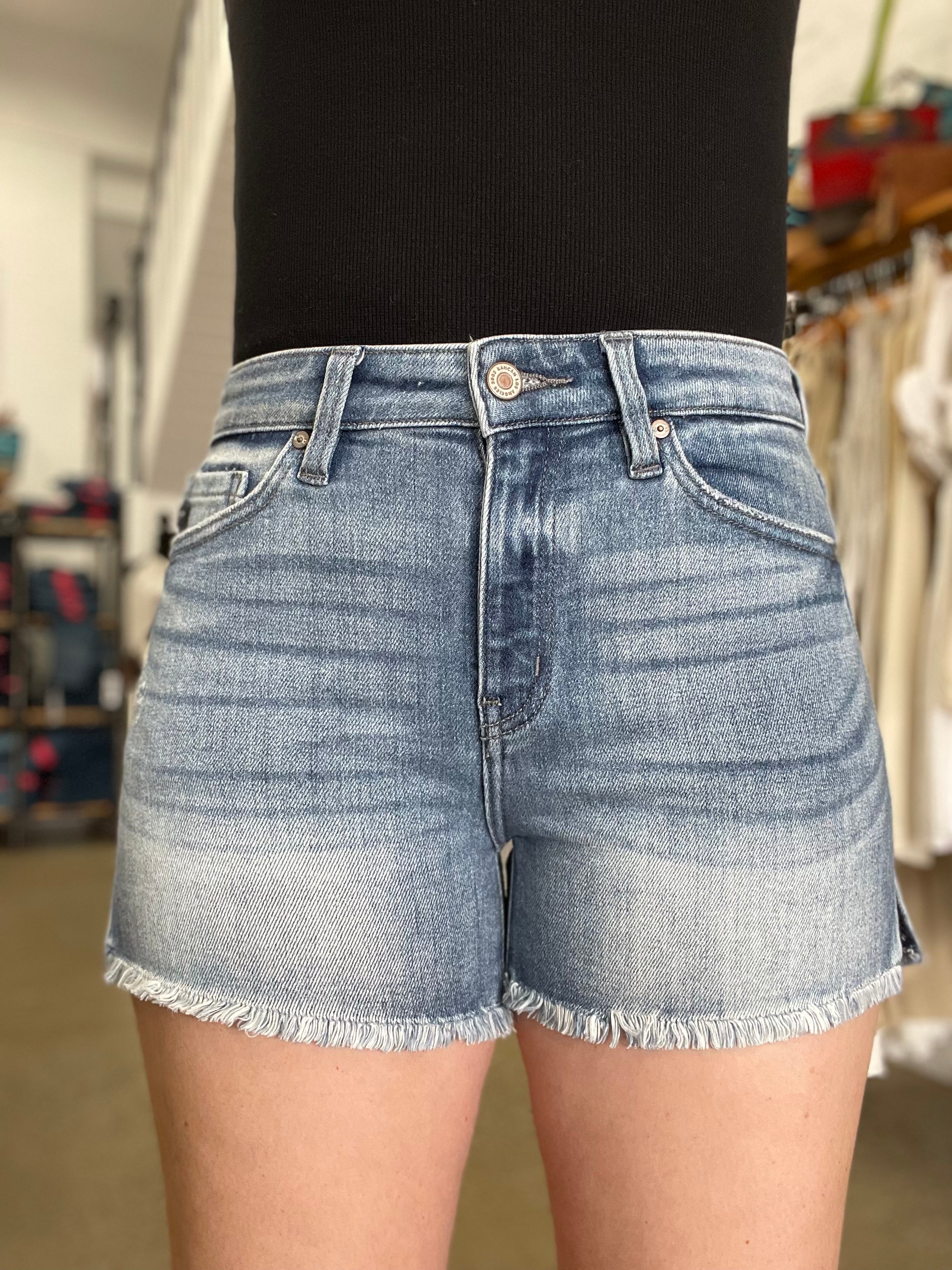 High rise featuring a frayed hem and slight rip detailing. 93% Cotton, 5% Polyester 2% Spandex.