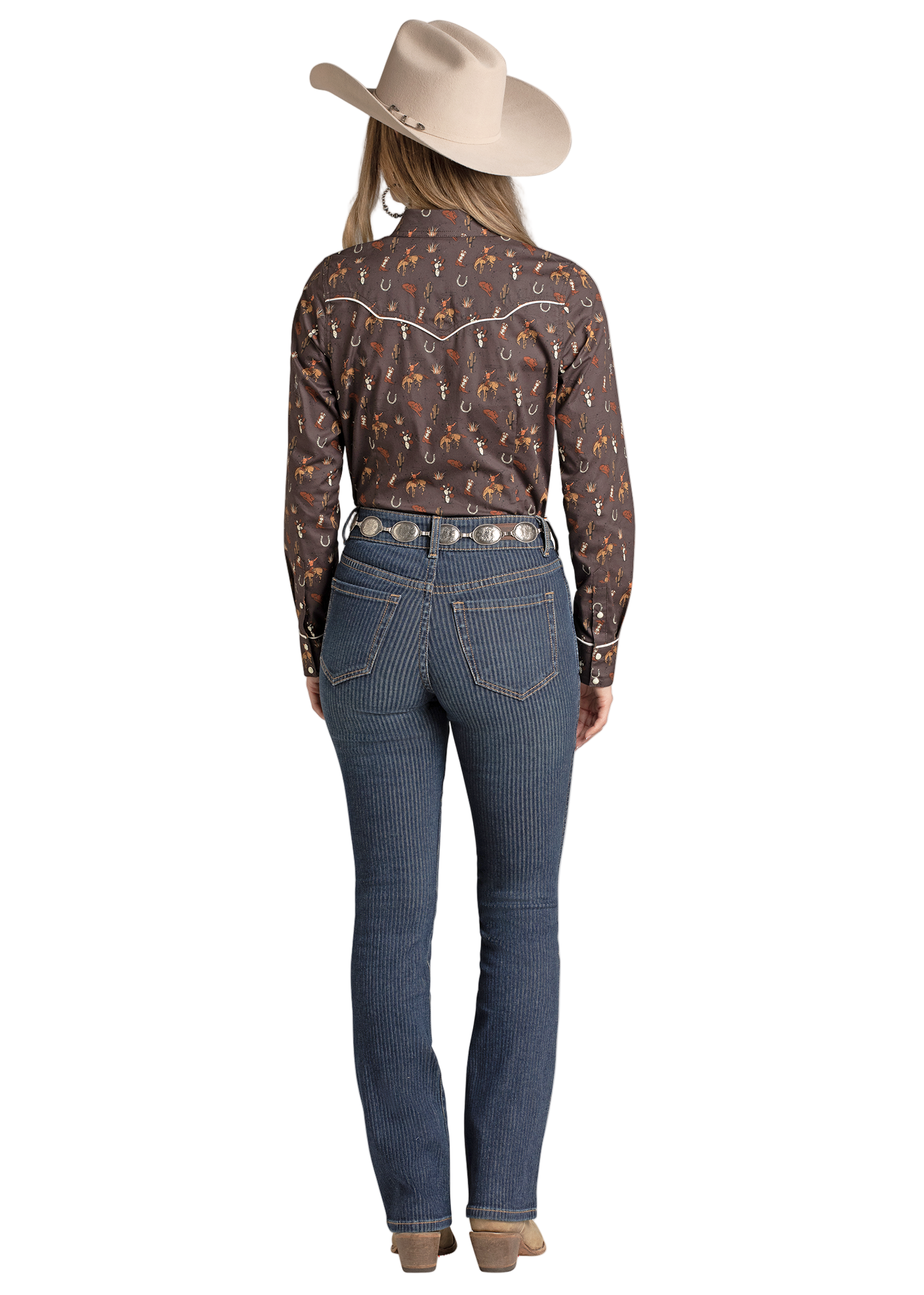 Rock and Roll brown long sleeved shirt featuring a cactus and bronc riding print with snap button closures. 97% Cotton 3% Elastane.