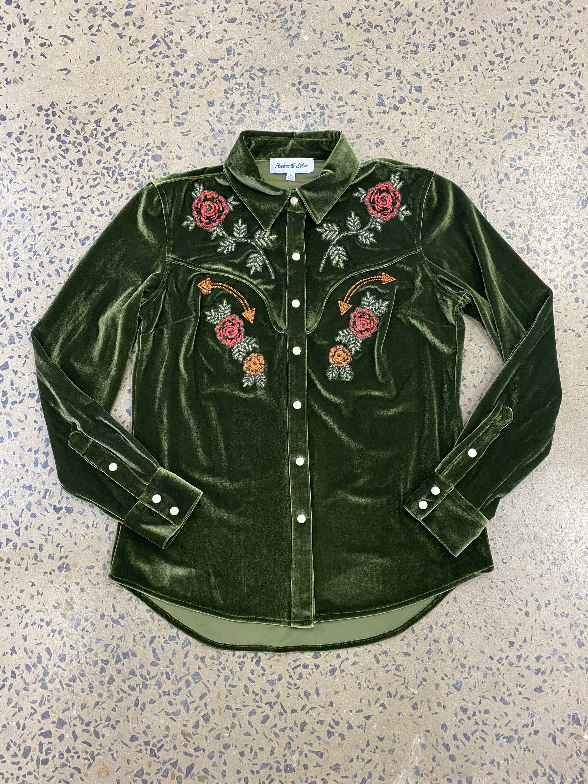 Rock and Roll long sleeved shirt featuring floral embroidery details on the front with snap button closures. 92% Polyester 8% Spandex.