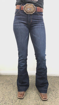 Kimes Ranch Jennifer is a dark wash, ultra high rise with a trouser cut leg. This jean sits just under the belly button and has a fitted thigh.
