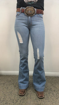 Kimes Ranch Jennifer Sugar Fade is a light wash, ultra high rise with a trouser cut leg. This jean sits just under the belly button. It features a fitted thigh with rips, flare leg and trouser cuff with fraying. This jean is made in America from the best quality denim which is 99% Cotton, 1% Spandex.