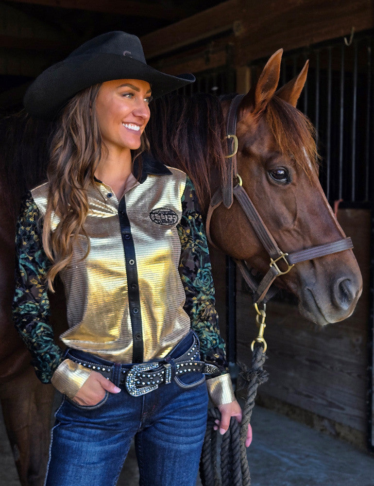 Cowgirl Tuff Pullover Arena Shirt - Gold Foil with Sheer Velvet Sleeves