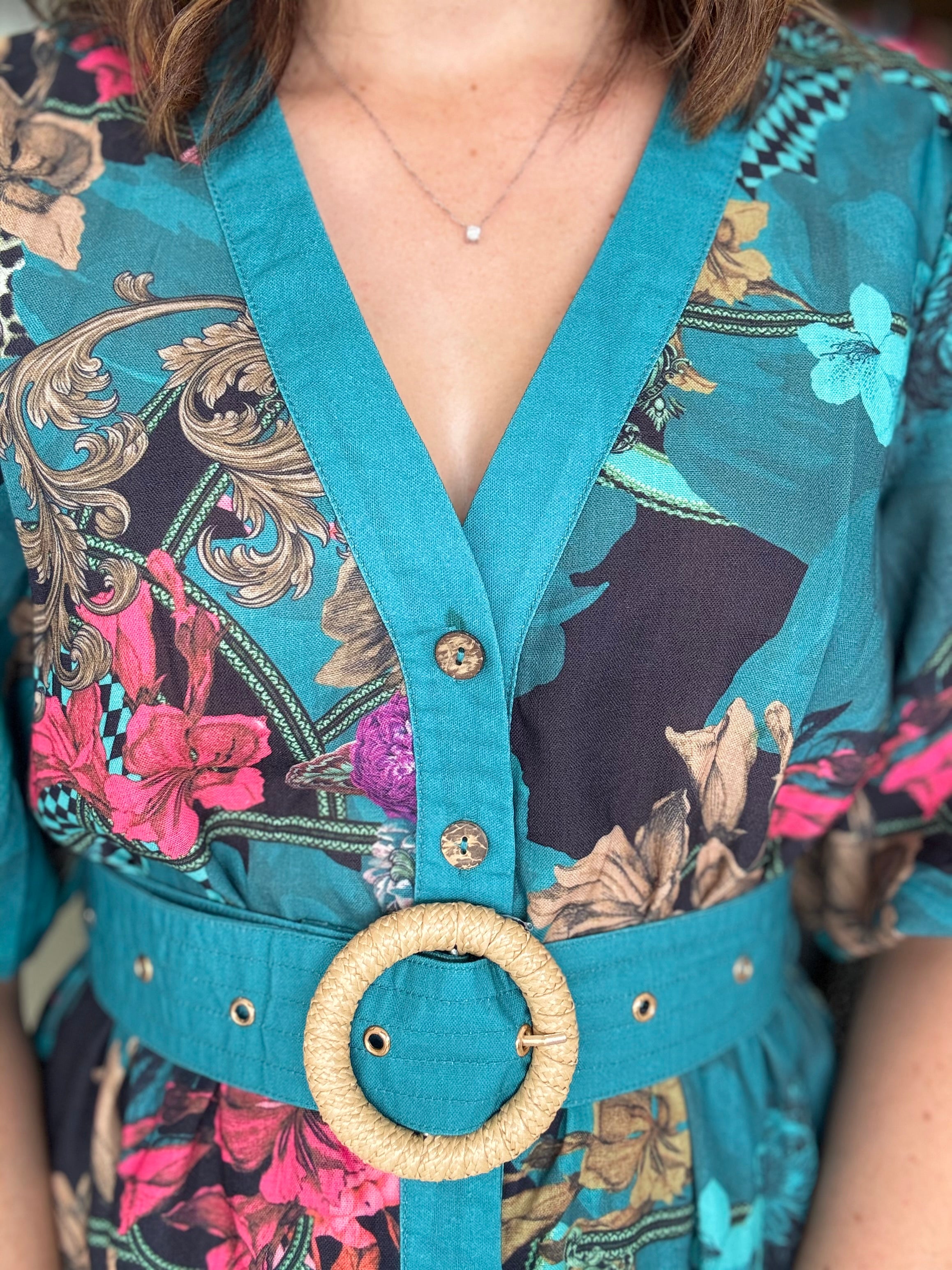Lucinda is a stunning maxi featuring long sleeves and a full button down front with a stunning green waist belt with a ratten buckle.