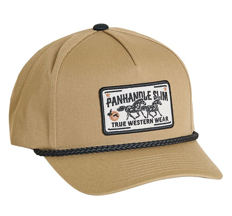 Panhandle Slim full fabric cap with a patch featuring a rope and curved brim.