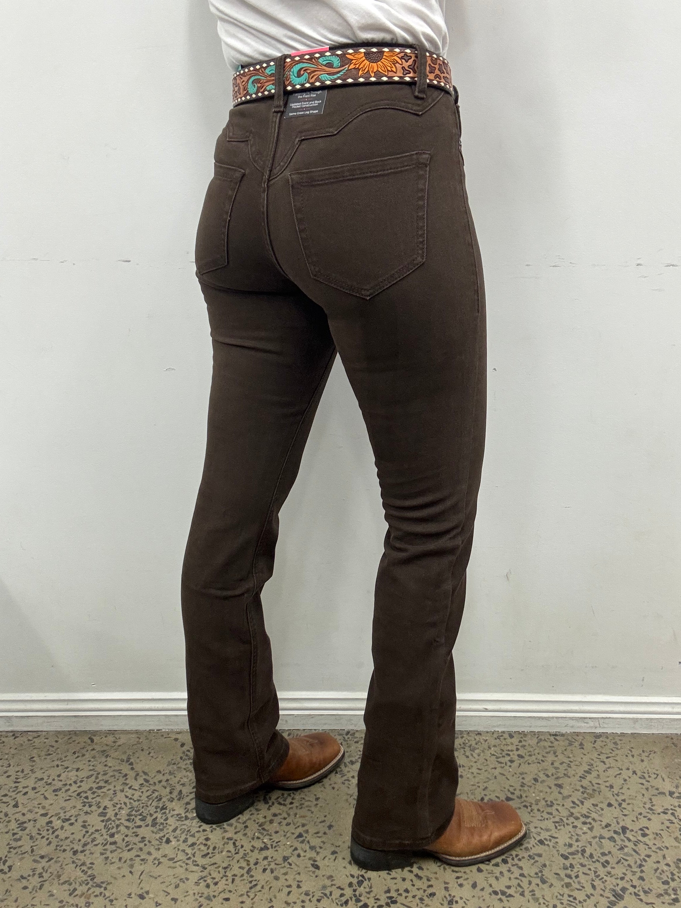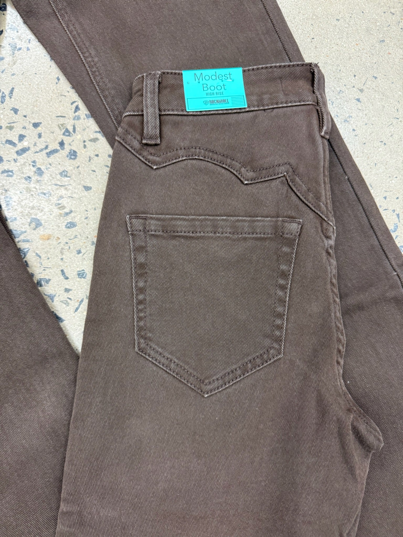 This Rock & Roll jean is a high rise bootcut jean in a brown denim with yoke detailing under the front pockets and on the back under the waist band.