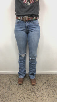 This Rock & Roll jean is a high rise bootcut jean in a light wash denim with rip detailing.