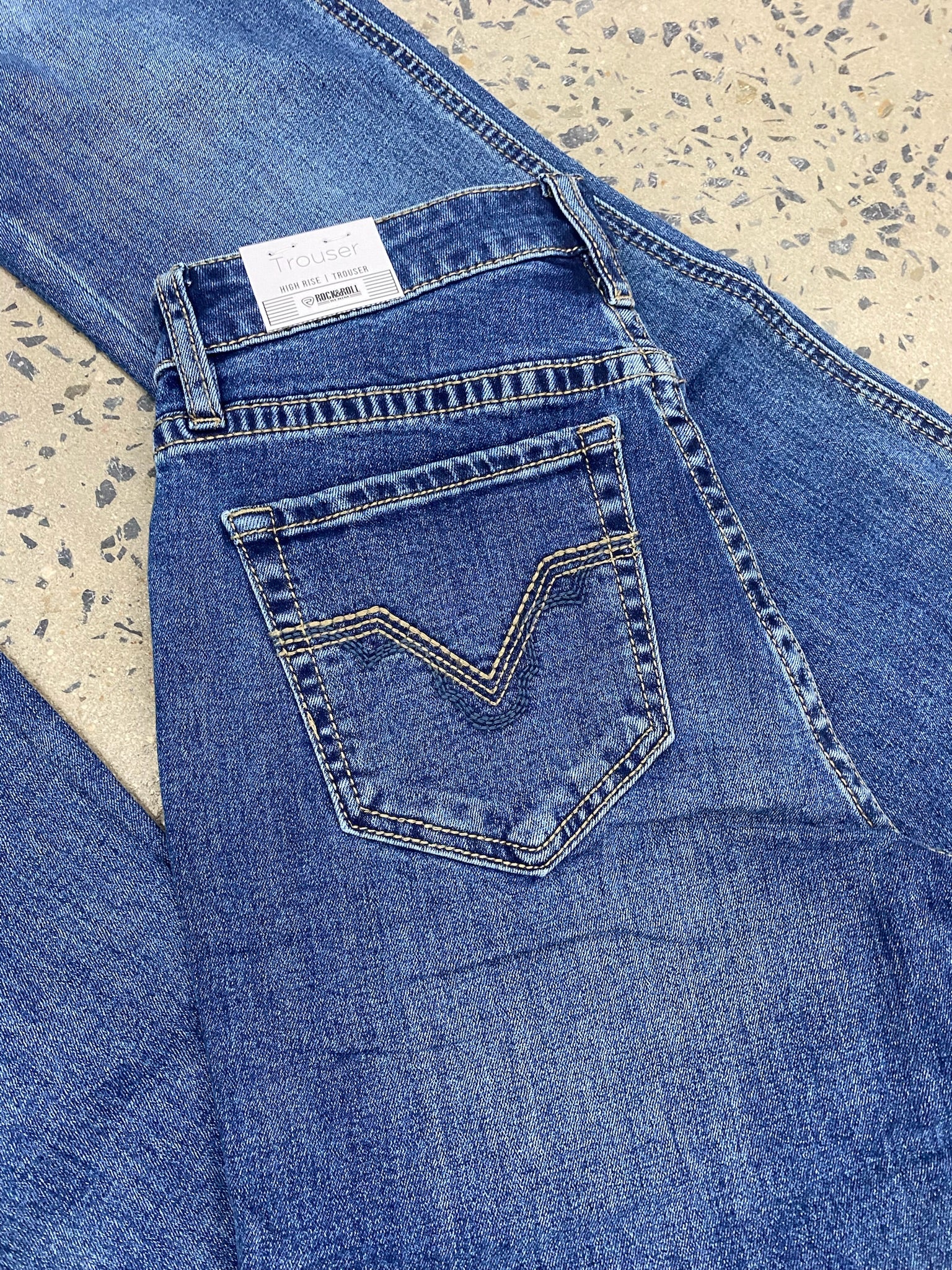 Rock & Roll high rise, trouser jean in a medium vintage wash denim. This jean is a high rise with a fitted knee. This jean features brown and navy stitching on the back pockets.