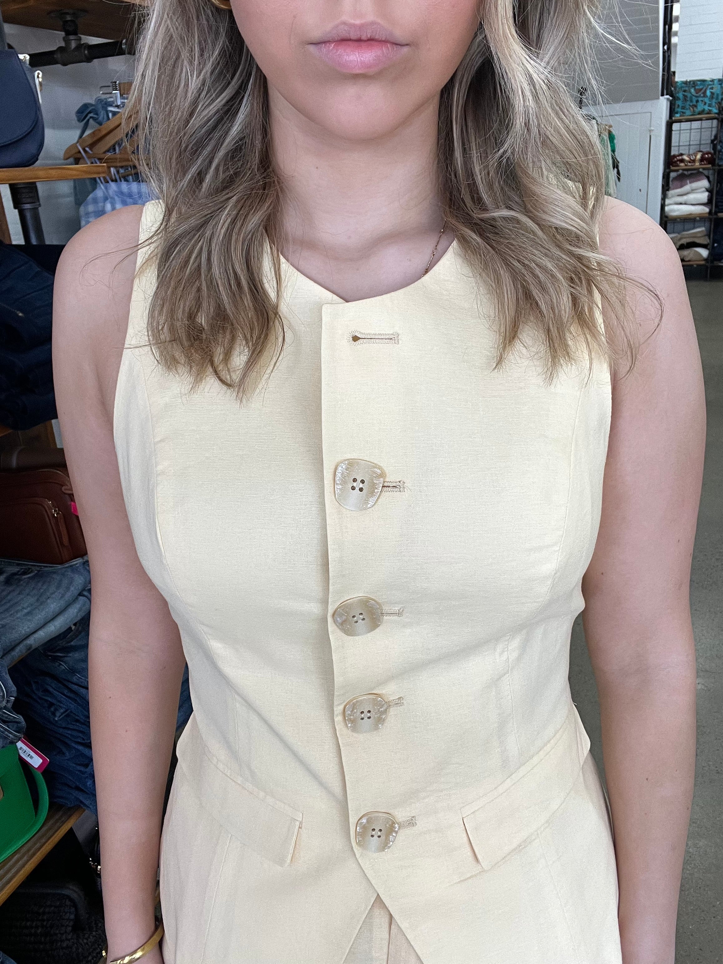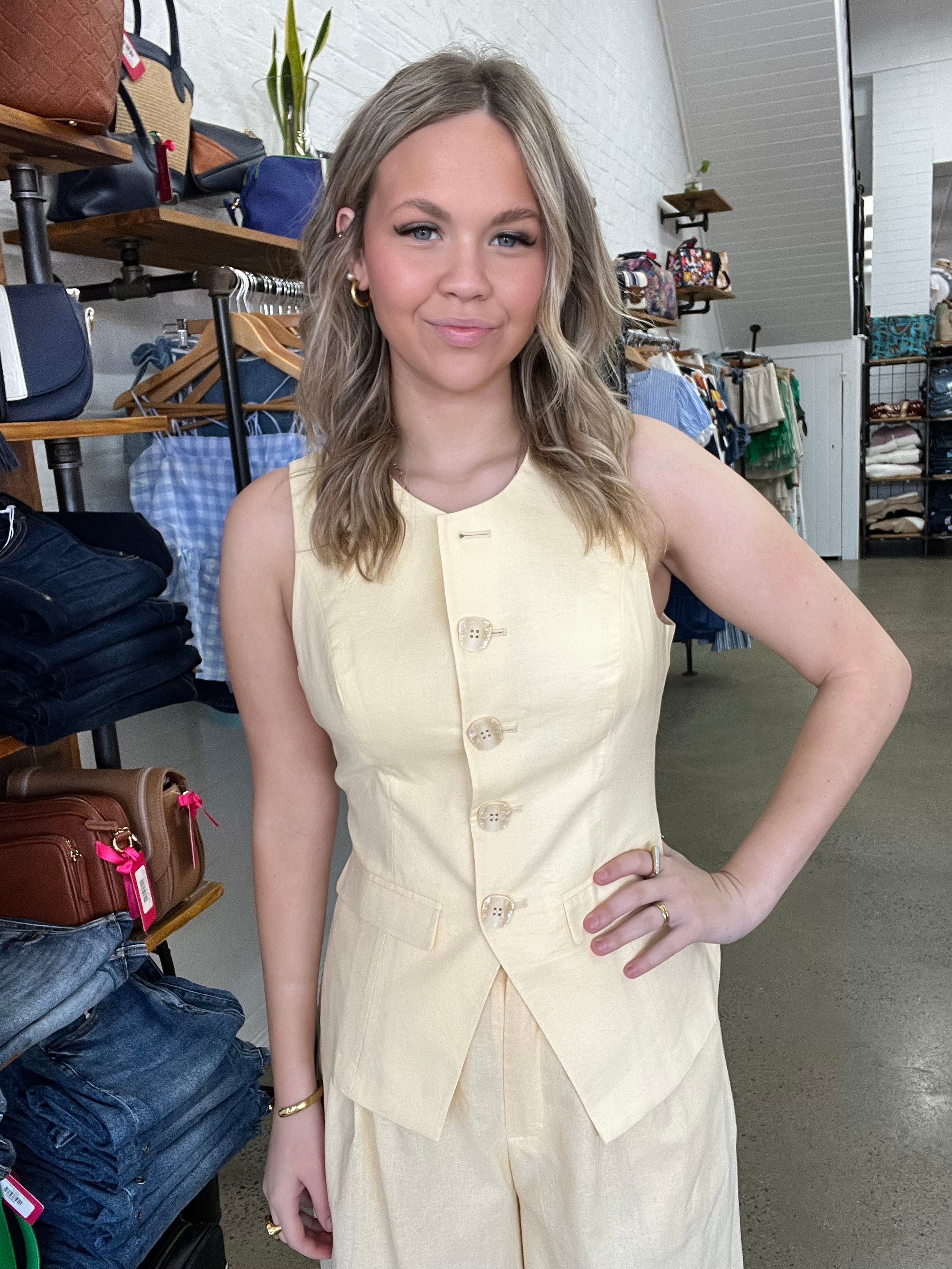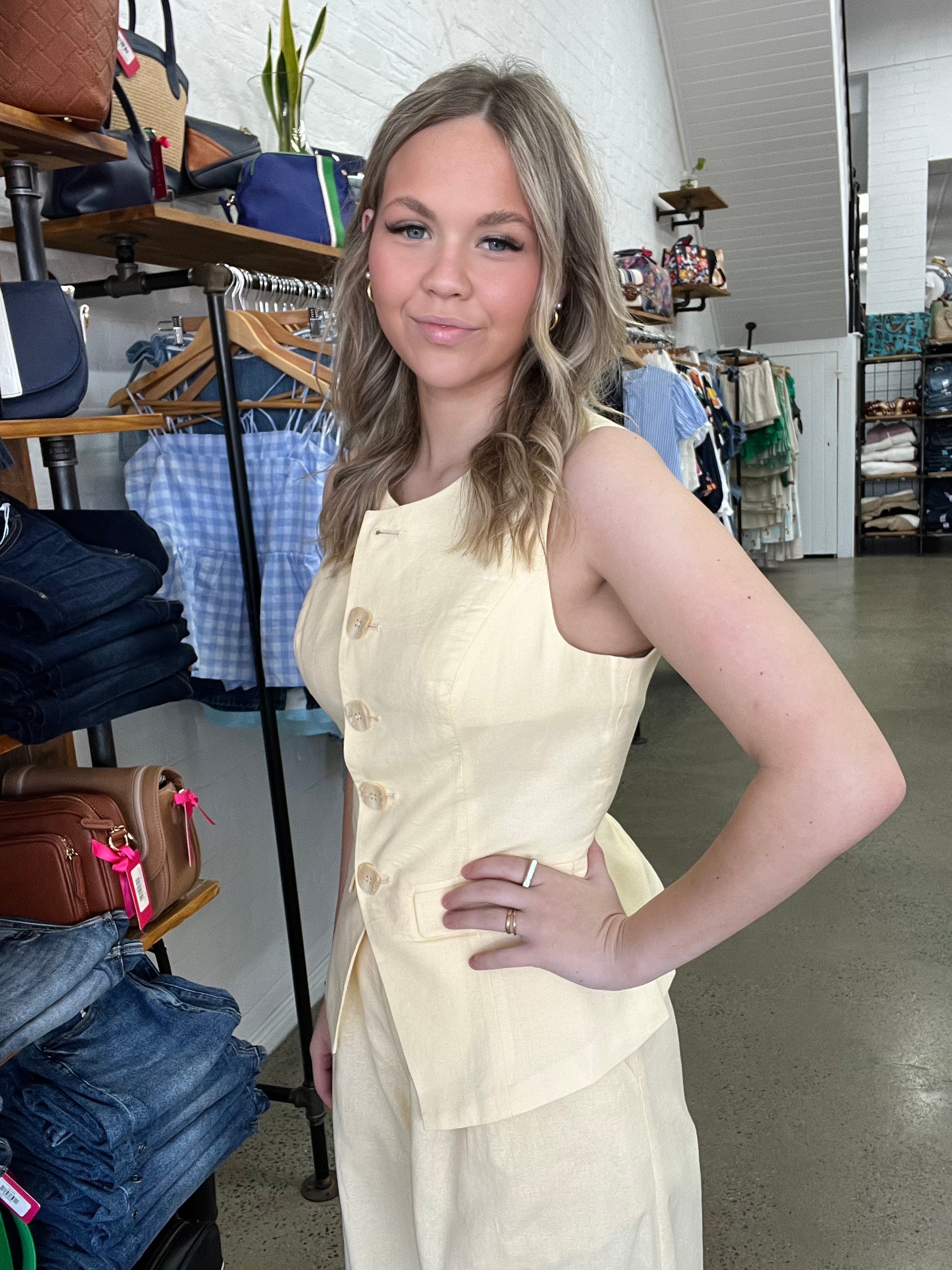 Alessa is stunning vest and tailored pant set. The top is detailed with statement buttons and a back tie closure, allowing you to cinch the waist for a flattering, custom fit. Paired with matching high-waisted bottoms, the set strikes the perfect balance between tailored and relaxed. 100% Cotton.