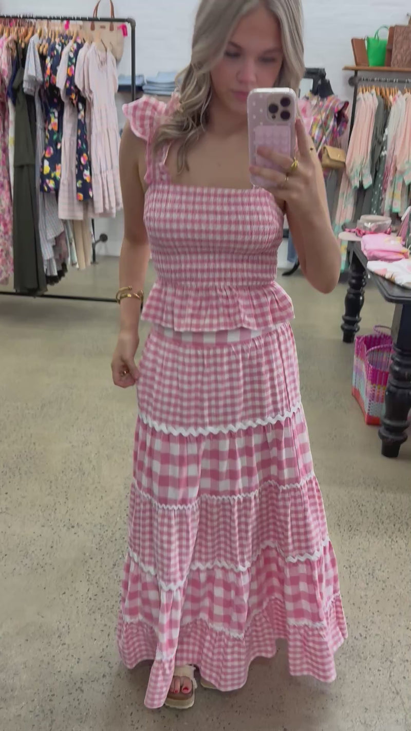 Bridger is a gorgeous two piece set in a pink gingham. The top has a square neckline and frilly sleeves. The skirt is high waisted and falls to a midi length with a lovely tiered detail at the bottom. Made of 100% Cotton