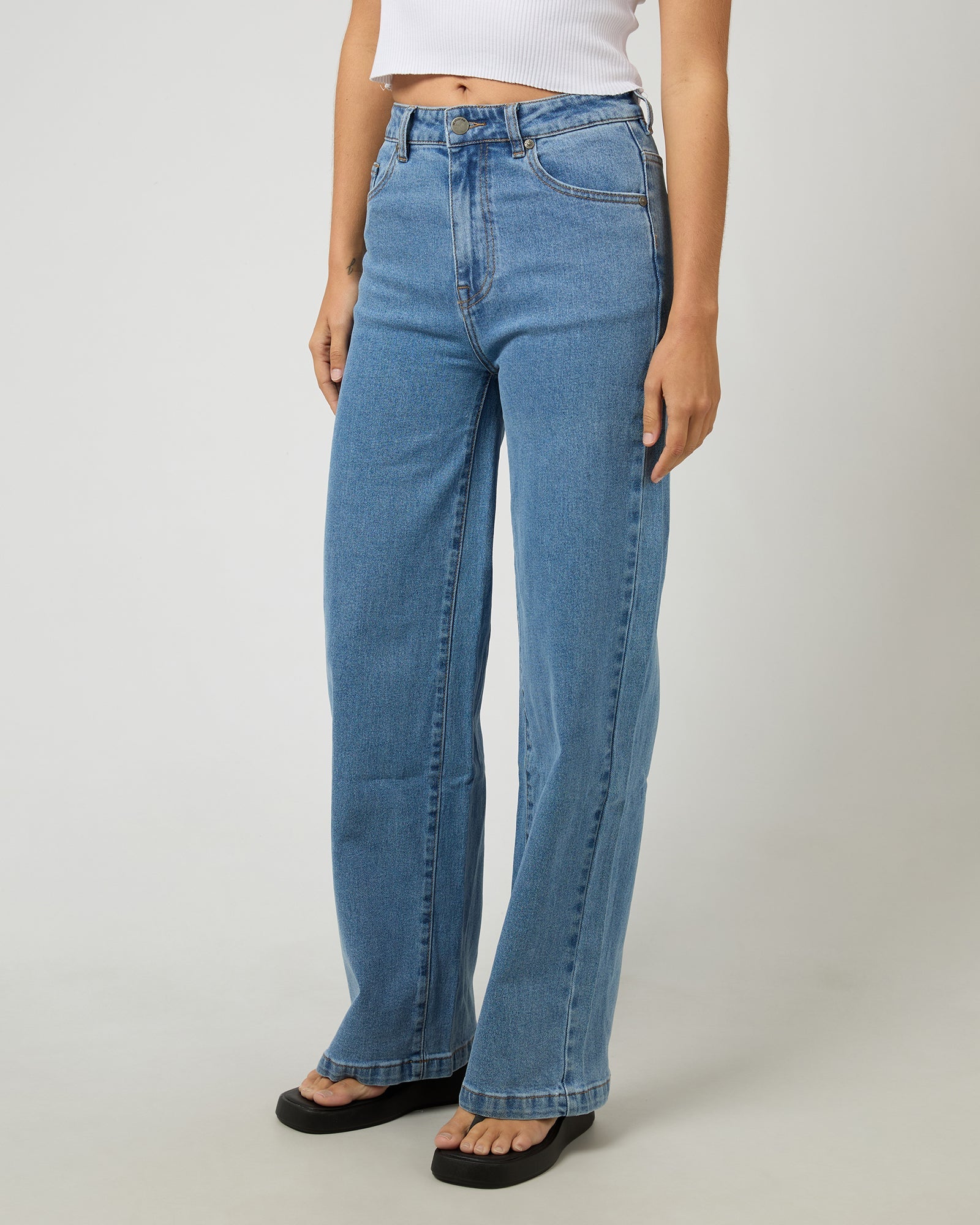 Our Jacqui Wide Leg Jean is a high rise fit which will sit just under you belly button at the front and slightly higher at the back. This jean is in a stunning light blue wash giving you that gorg denium finish to any outfit.