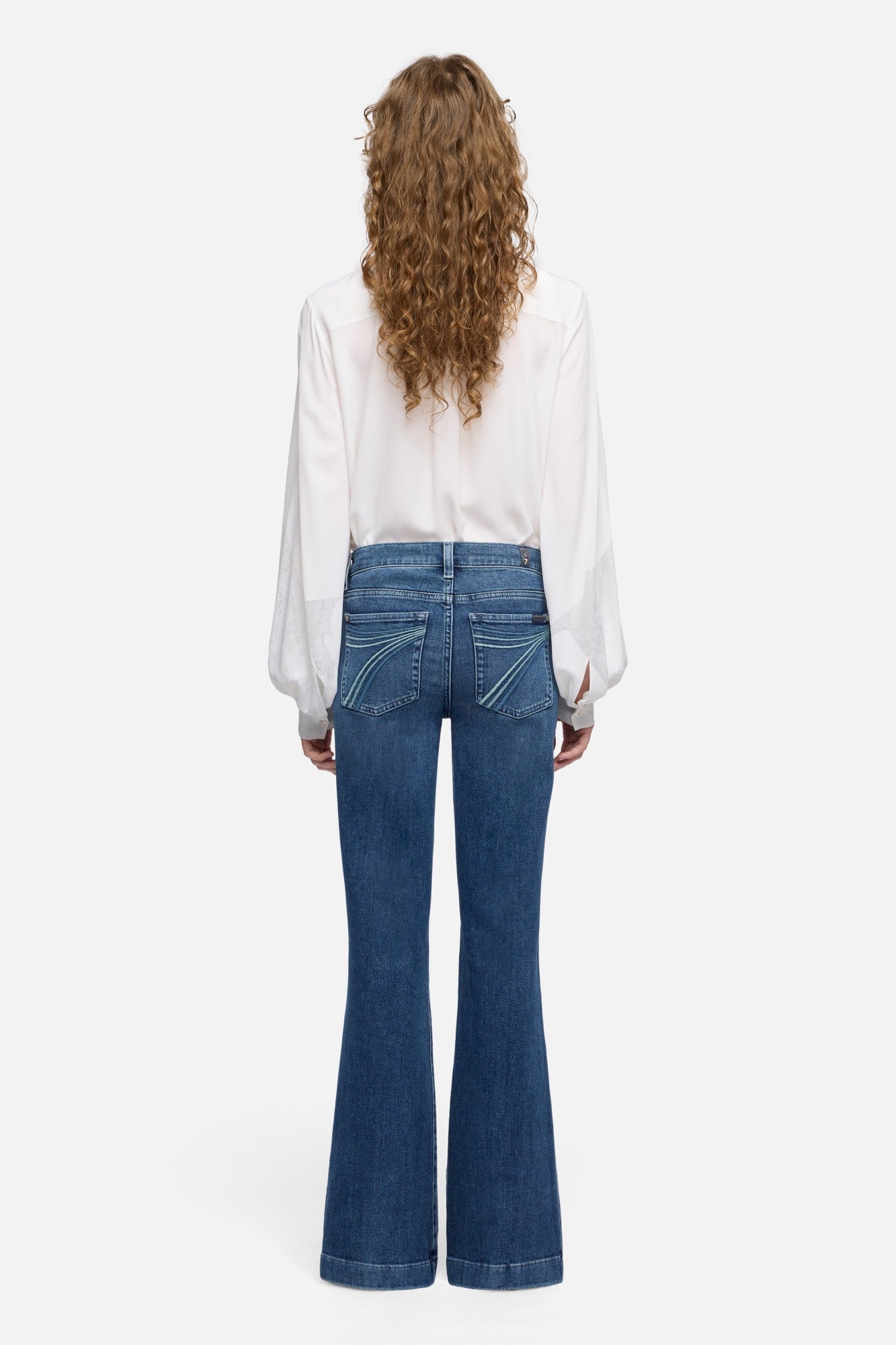 The iconic 7 For All Mankind jean, in a must-have trouser silhouette - The Dojo Flux. Featuring a mid rise and a subtle flare alongside a standout Blue Colourway, sparkle embroidered 7 pockets and silver accents. This mid blue wash is a timeless wardrobe staple that you'll be loving for years to come.