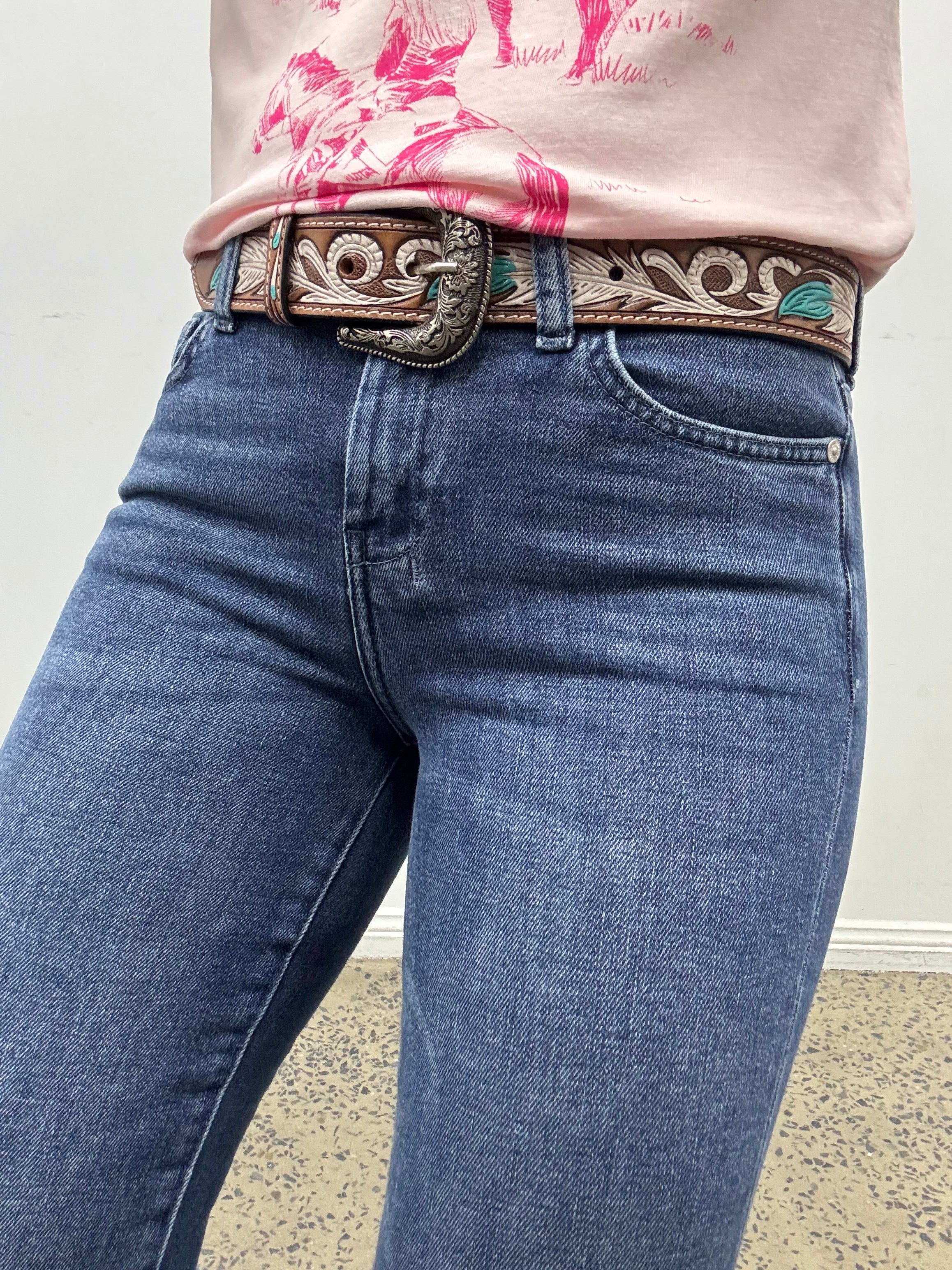 LEG LENGTH - Leg length of jeans is always the second number in jeans size for example a 25/34 is a waist size 25 with a 34 inch leg length. If trouser cut/flare jeans are longer than the actual length of your leg, unlike bootcut, you don't get 'scrunch' you get 'drag'. Because they are wide at the bottom they won't sit up on your boot, they will sit over it so anything longer than the actual length of your inside leg is going to drag. We recommend if you want a flare/trouser jeans for riding to go longer and cuff the bottom hem up when walking around. To work out the length you need for dress jeans just measure your inside leg from croutch to the floor in inches. If your leg measures 32 get a 32, if it measures 33 get a 34 etc.