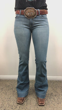 Kimes Ranch Lola is a light wash, true mid rise jean with a trouser cut. This jean sits just under the belly button. It features a fitted thigh with flare leg and trouser cuff. Night on the town or day in the saddle this jean is so versatile! This is the jean you have been waiting to add to your wardrobe.