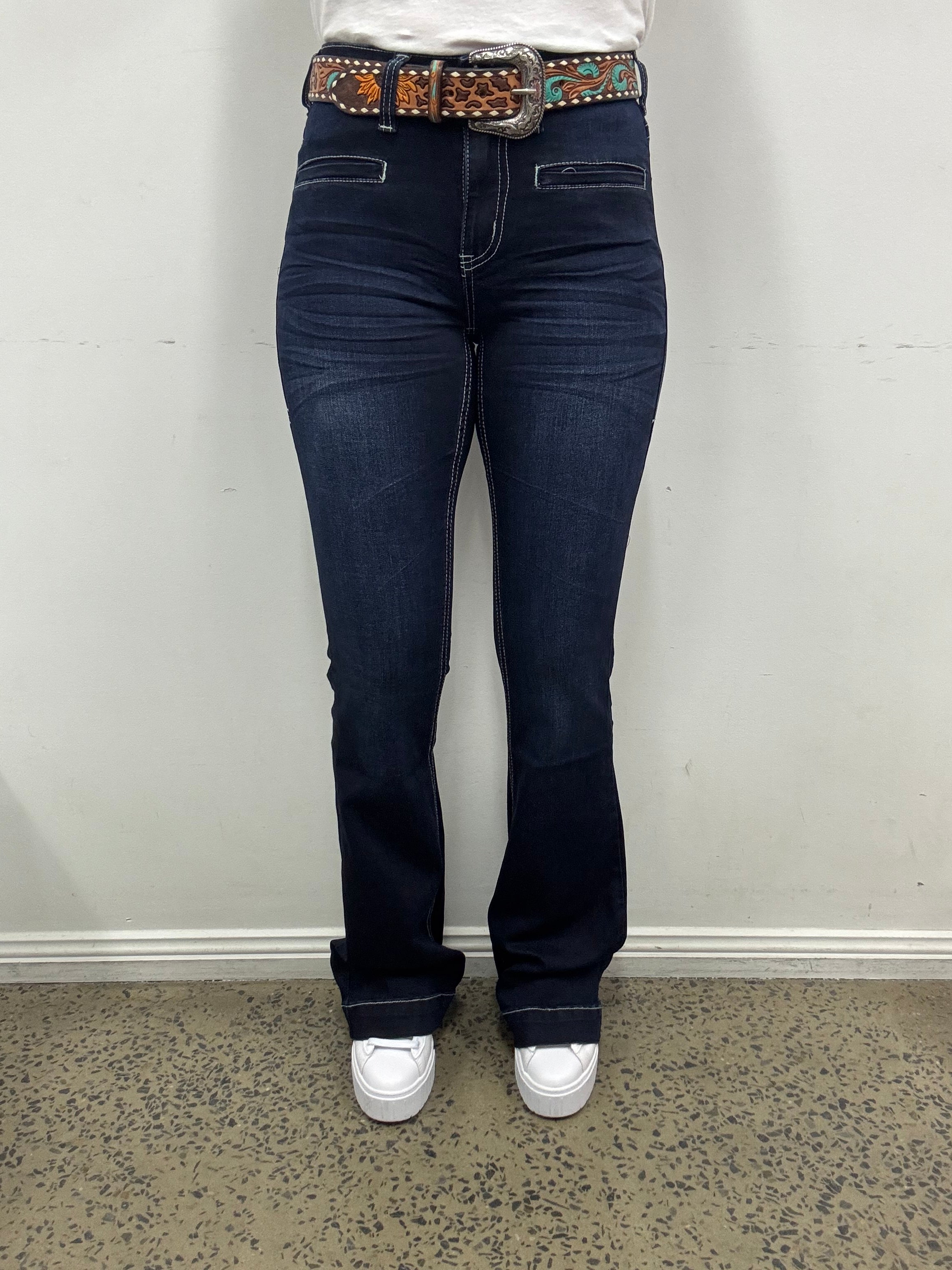 The Cowgirl Tuff Boot Stitch jean is a dark wah, cuffed hem trouser style with striking white overall stitching and sleek welt front pockets. The back pockets are higher set, larger pockets with boot stitch embroidery.