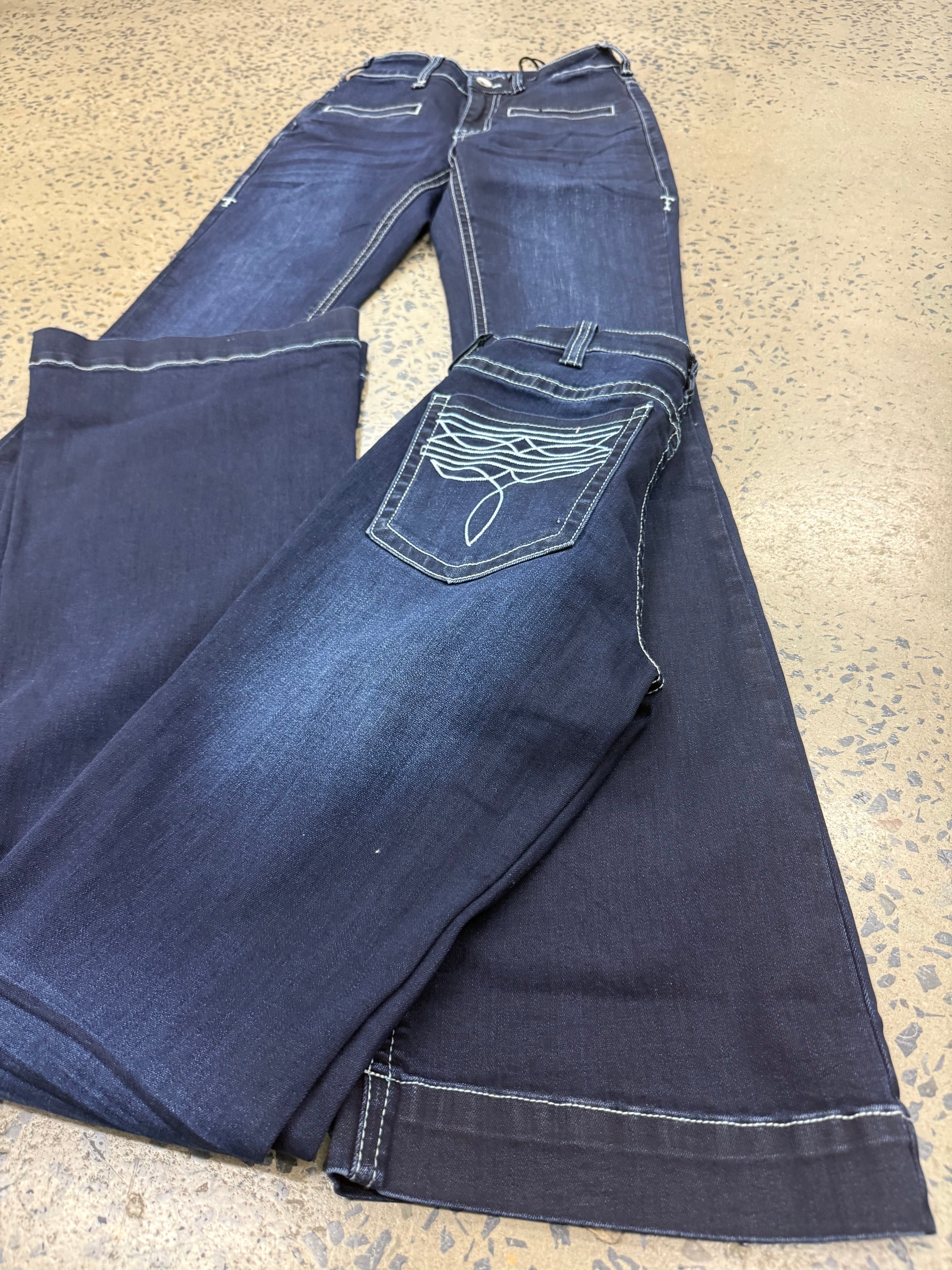 LEG LENGTH - Leg length of jeans is always the second number in jeans size for example a 25/34 is a waist size 25 with a 34 inch leg length. If trouser cut/flare jeans are longer than the actual length of your leg, unlike bootcut, you don't get 'scrunch' you get 'drag'. Because they are wide at the bottom they won't sit up on your boot, they will sit over it so anything longer than the actual length of your inside leg is going to drag. We recommend if you want a flare/trouser jeans for riding to go longer and cuff the bottom hem up when walking around. To work out the length you need for dress jeans just measure your inside leg from croutch to the floor in inches. If your leg measures 32 get a 32, if it measures 33 get a 34 etc