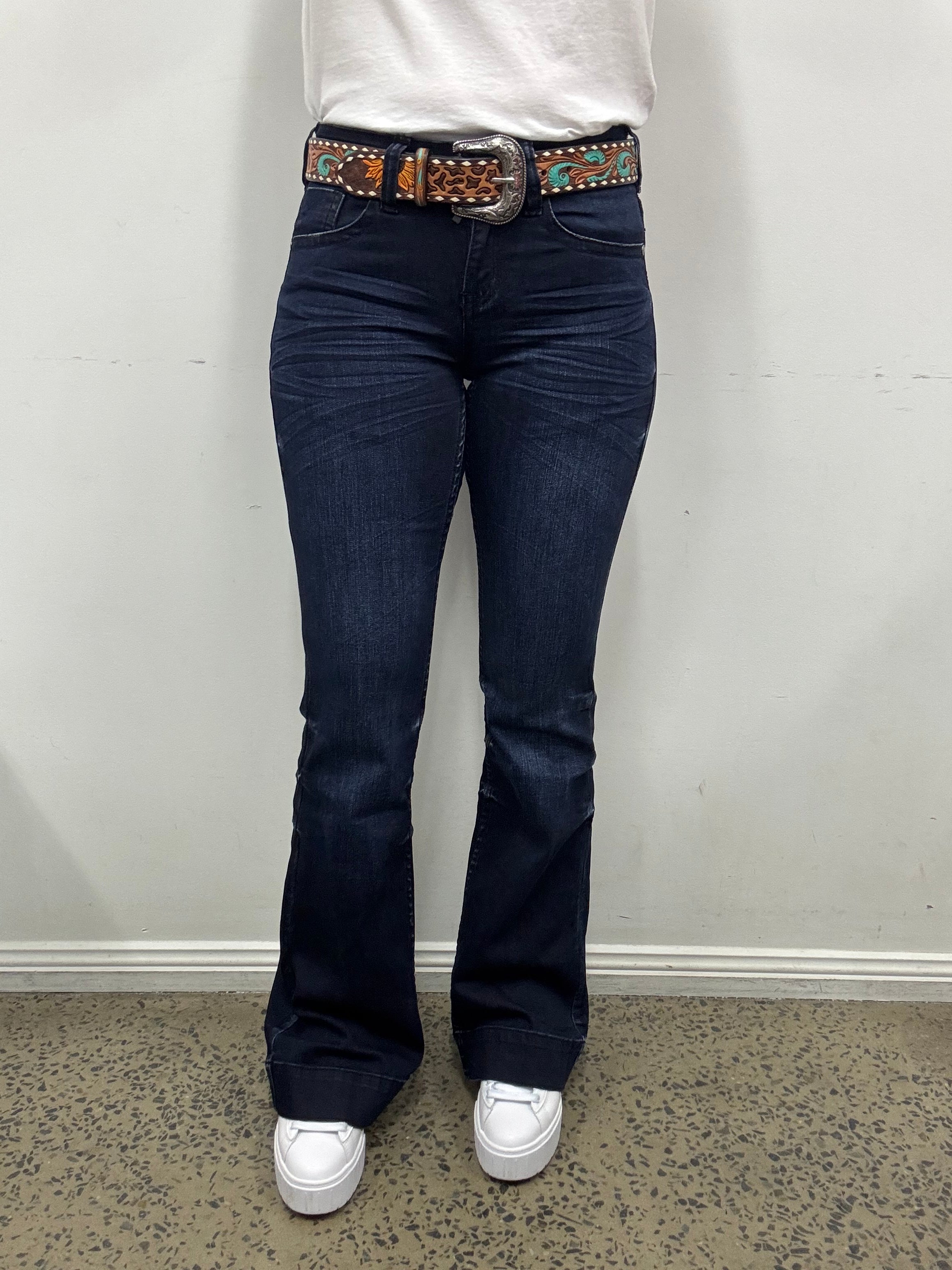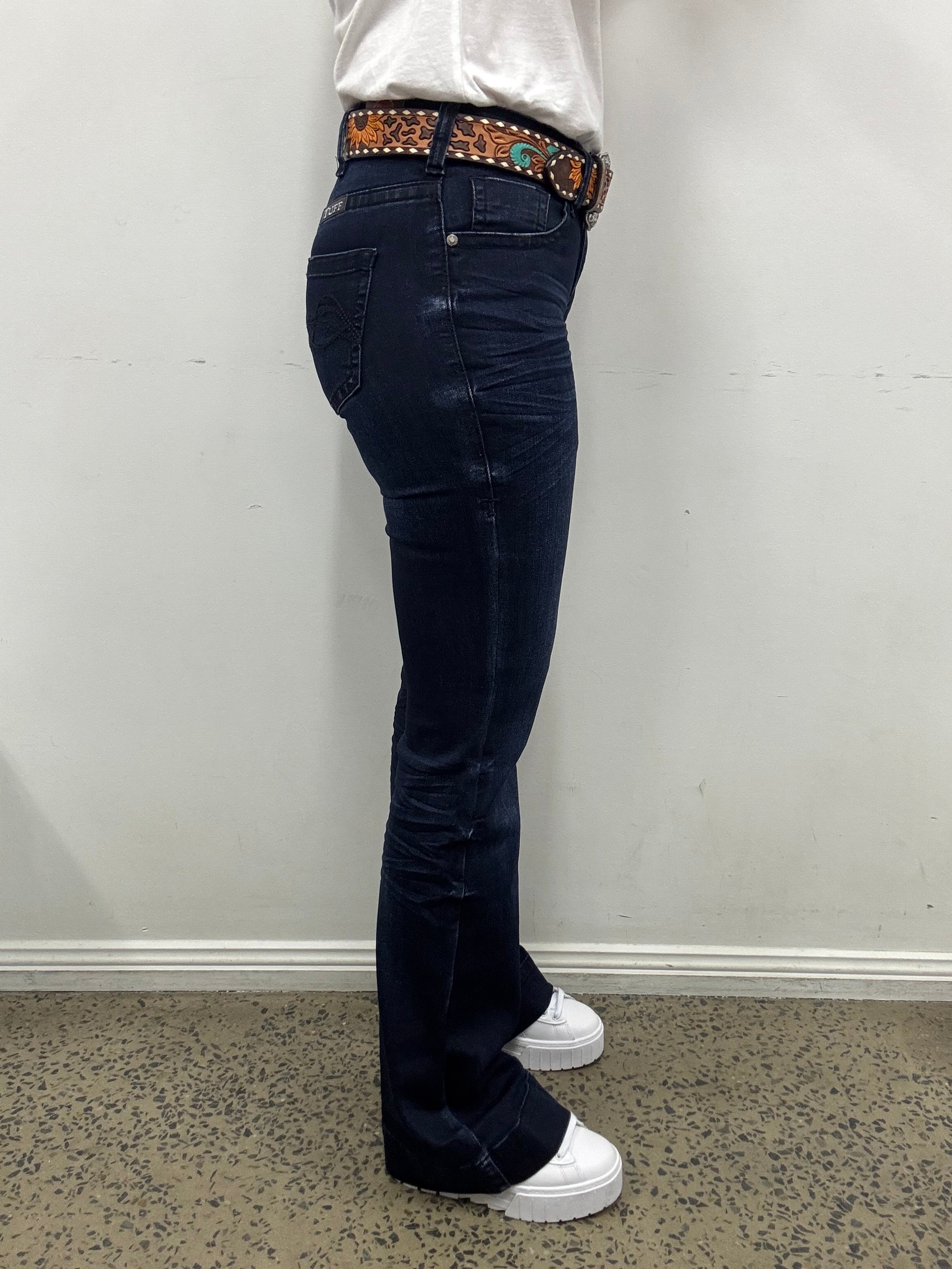 The Cowgirl Tuff Deep Sapphires jean is a dark wash style featuring a hint of wearing & whisking in a trouser cut. Limited Edition.