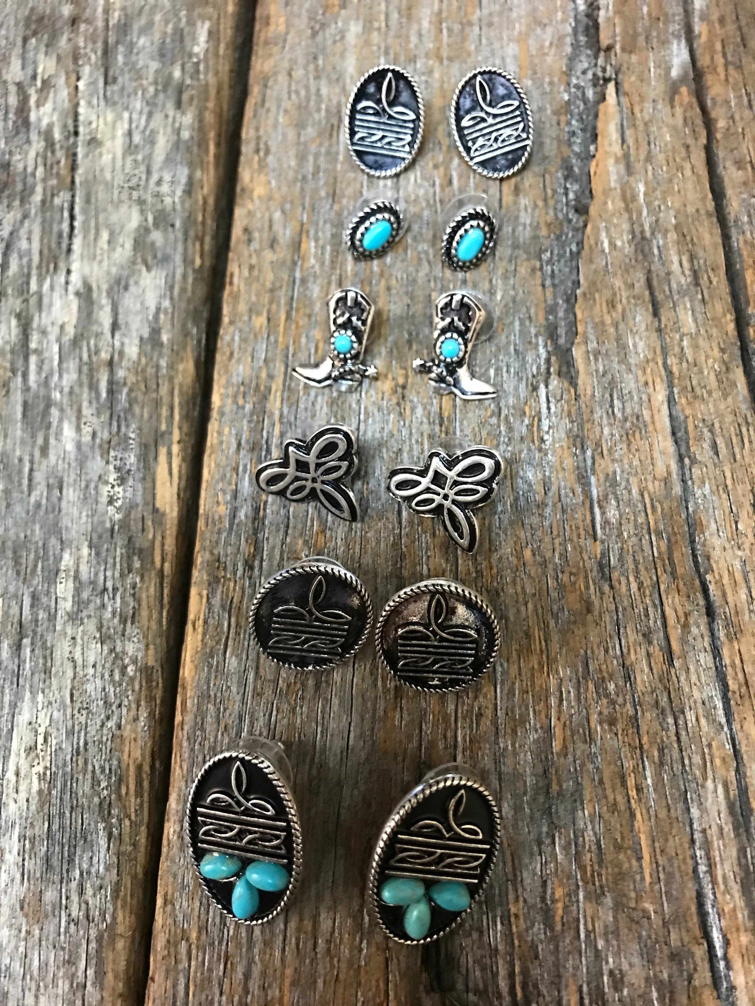 Set of six pairs of boot and boot stitch themed stud earrings. Vintage silver and turquoise stones.