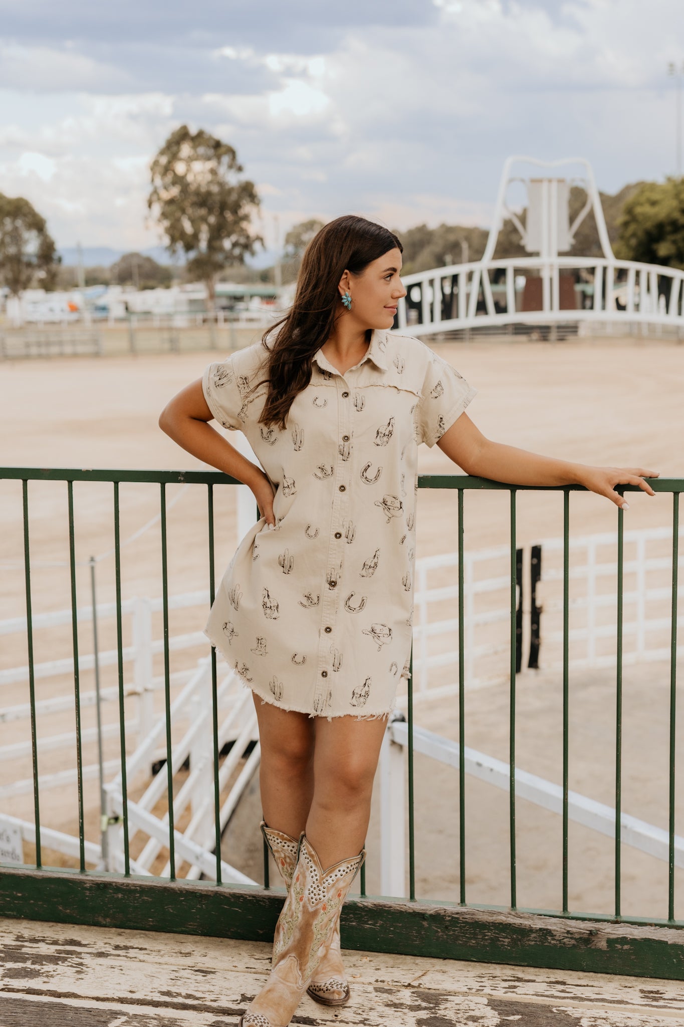 Stella is a stunning western style print shirt dress with a collar, full button up front and a frade hem across the chest. BONUS! She has pockets! 100% Cotton.