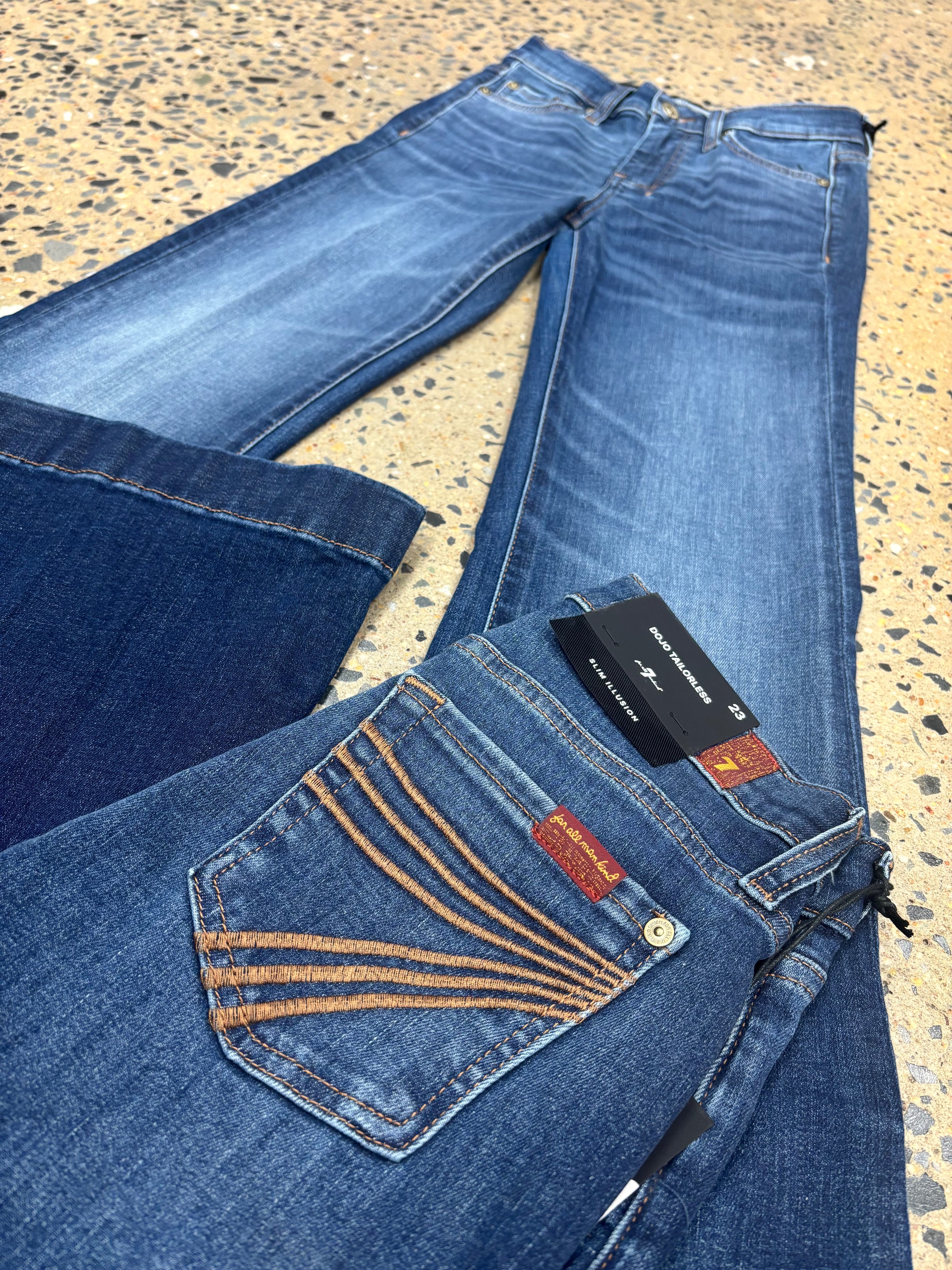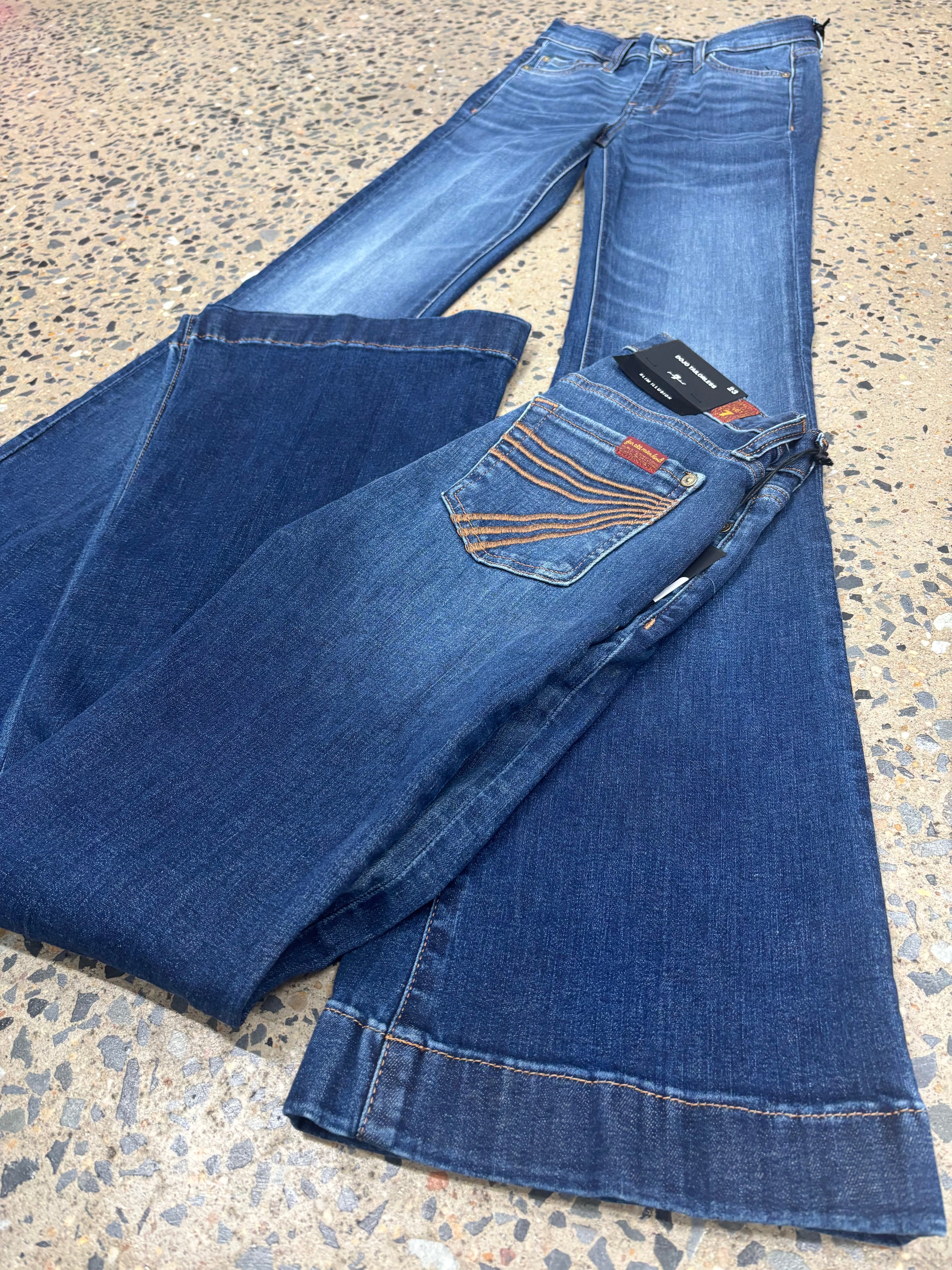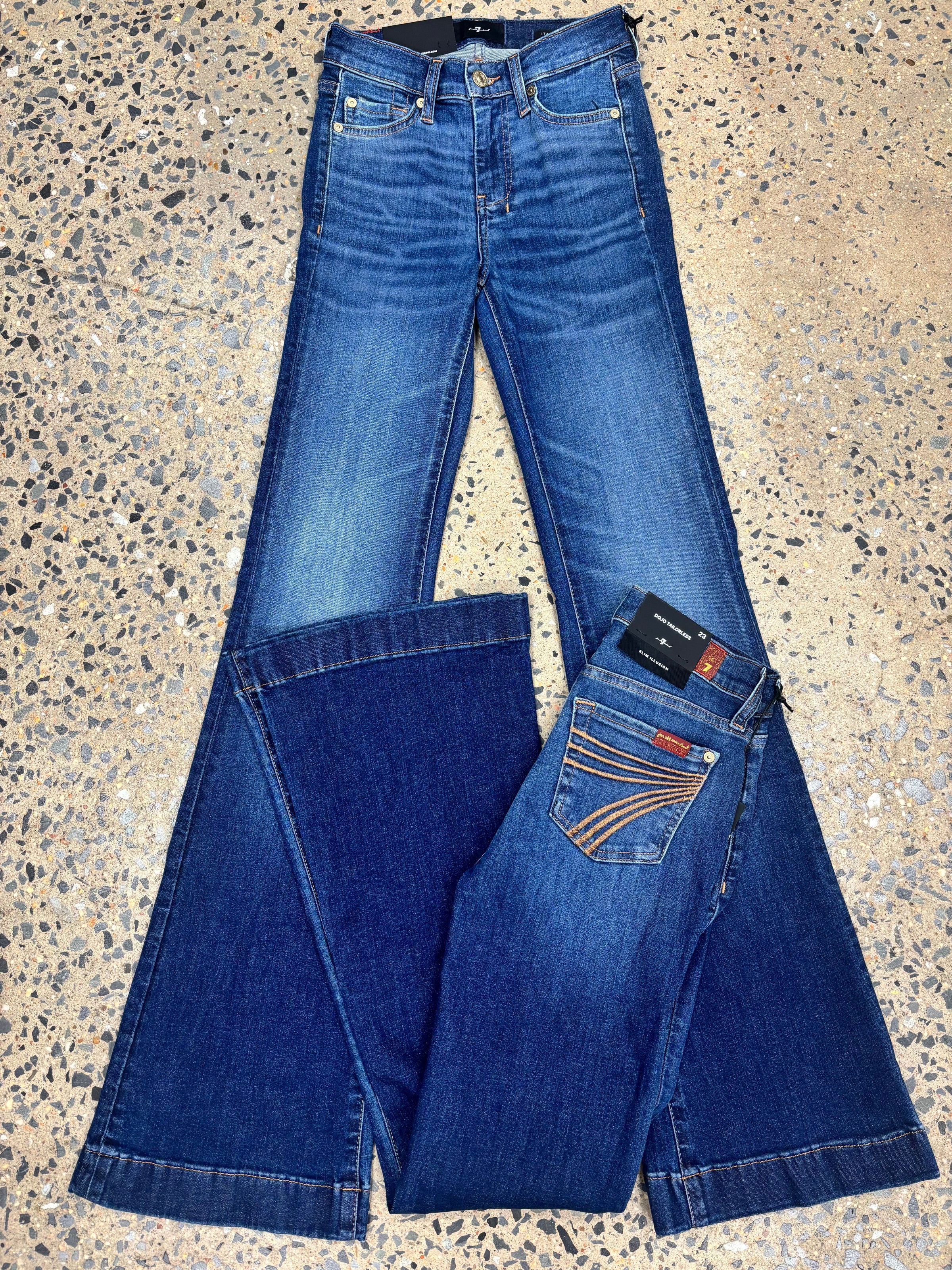 The iconic 7 For All Mankind jean, in a must-have flare silhouette - The Dojo Loom. Featuring a mid rise that is fitted through the thighs with a flare. Alongside the signature Gold embroidered 7 pockets and gold accents. This dark blue wash is a timeless wardrobe staple that you'll be loving for years to come.