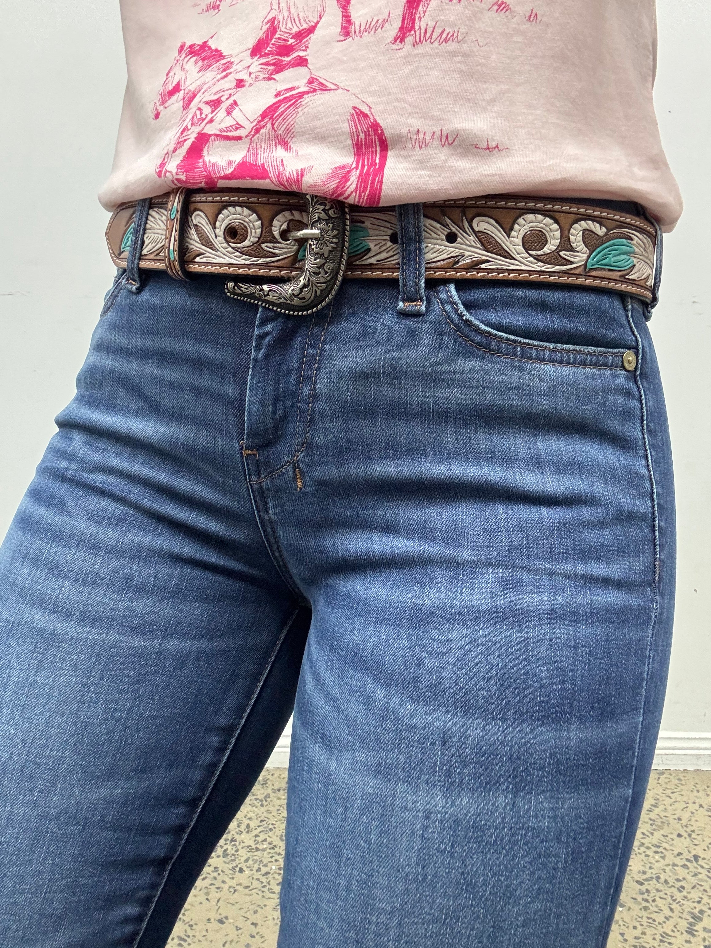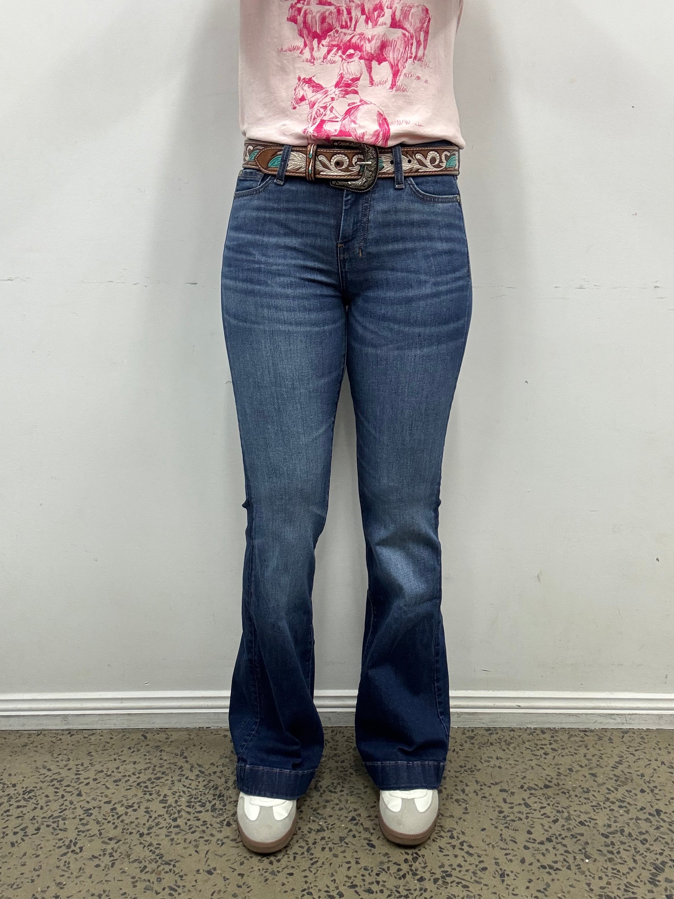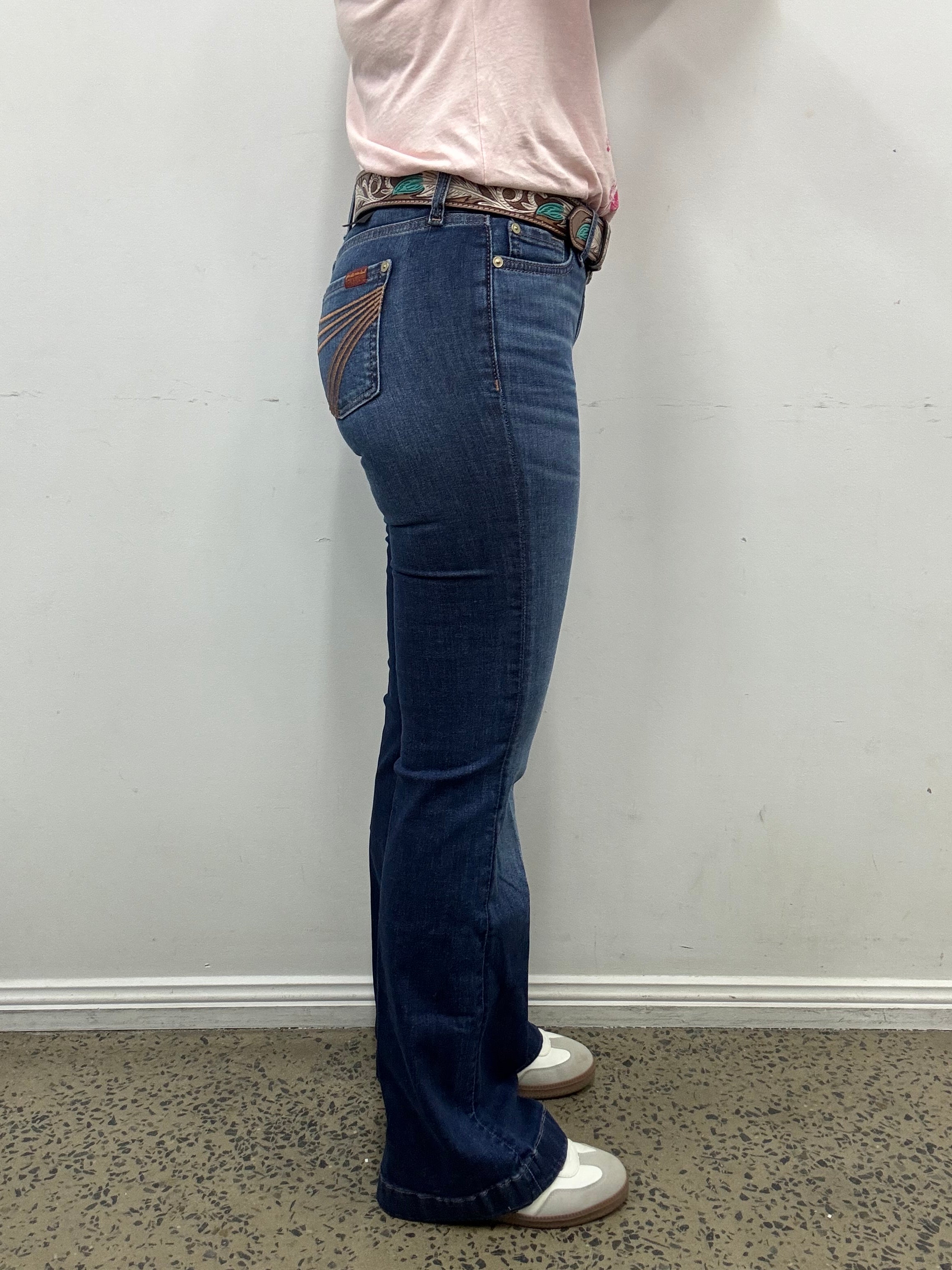 LEG LENGTH - Leg length of jeans is always the second number in jeans size for example a 25/34 is a waist size 25 with a 34 inch leg length. If trouser cut/flare jeans are longer than the actual length of your leg, unlike bootcut, you don't get 'scrunch' you get 'drag'. Because they are wide at the bottom they won't sit up on your boot, they will sit over it so anything longer than the actual length of your inside leg is going to drag. We recommend if you want a flare/trouser jeans for riding to go longer and cuff the bottom hem up when walking around. To work out the length you need for dress jeans just measure your inside leg from croutch to the floor in inches. If your leg measures 32 get a 32, if it measures 33 get a 34 etc.