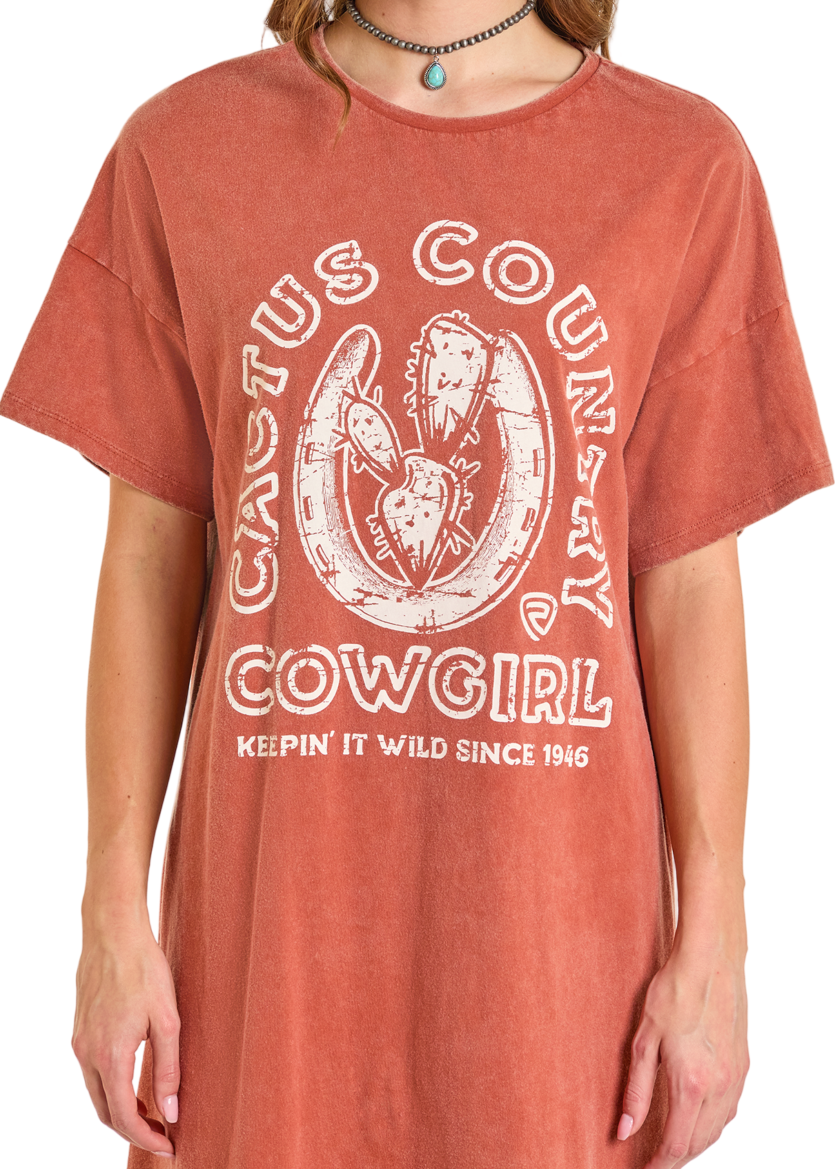 Rock & Roll graphic tee shirt dress with short sleeves and a crew neck in rust. 100% Cotton.